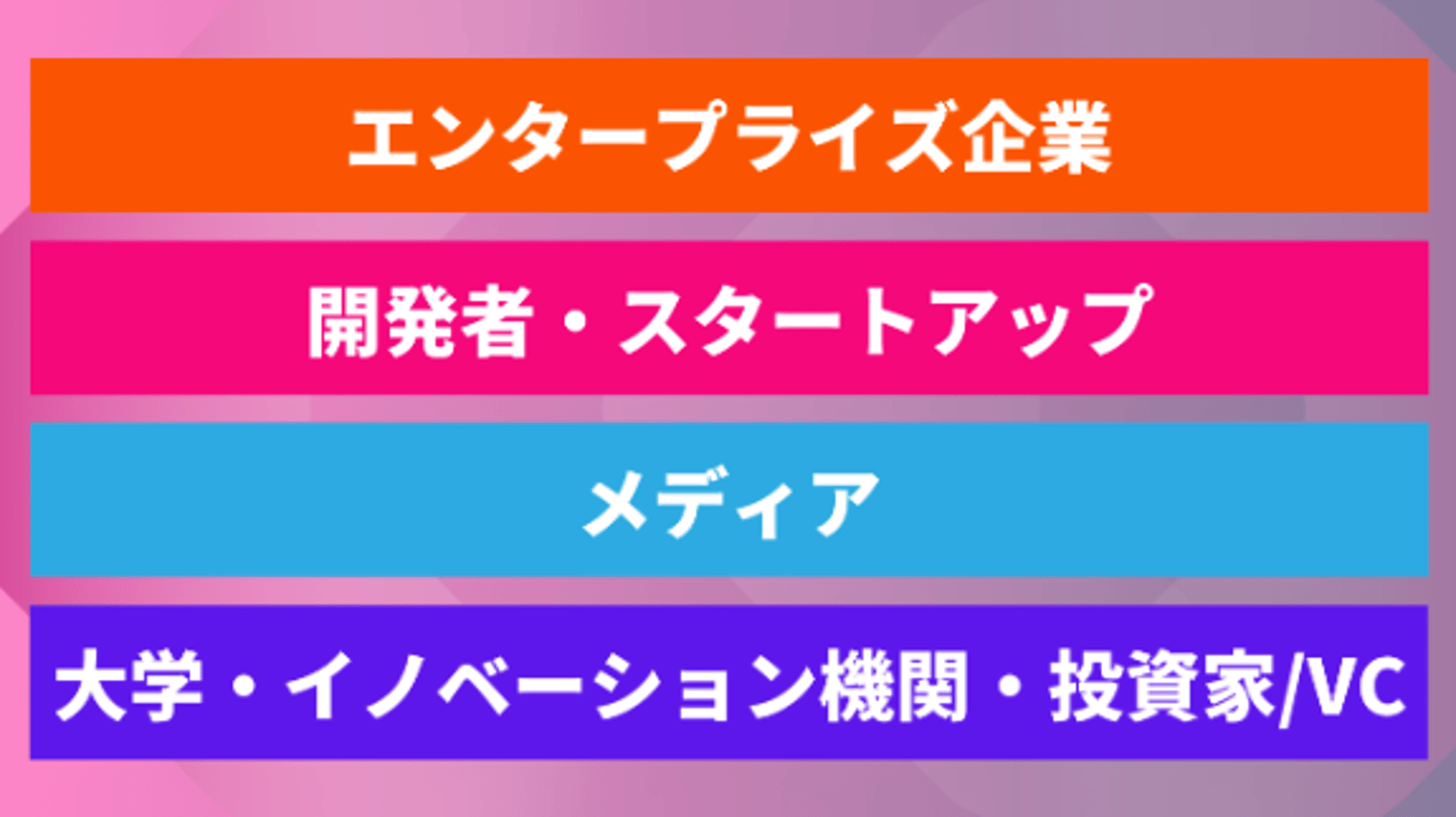 エンタープライズ/企業、開発者/デベロッパー・スタートアップ、メディア、大学・イノベーション機関、投資家/VC等にご参加いただき、今後のエコシステムをブーストさせるパートナーシップや共創に関する構想を提起させていただければと思います。
