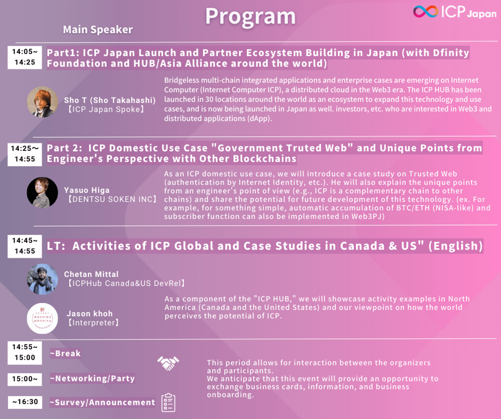 Speaker: As an ICP domestic use case, we will introduce a case study on Trusted Web (authentication by Internet Identity, etc.). Yasuo will also explain its unique points from an engineer's point of view (e.g., ICP is a complementary chain to other chains) and share the potential for future development of this technology. (e.g.,simple tasks like automatic accumulation of BTC or ETH (similar to NISA) or subscriber functions that can also be implemented in Web3 Project)