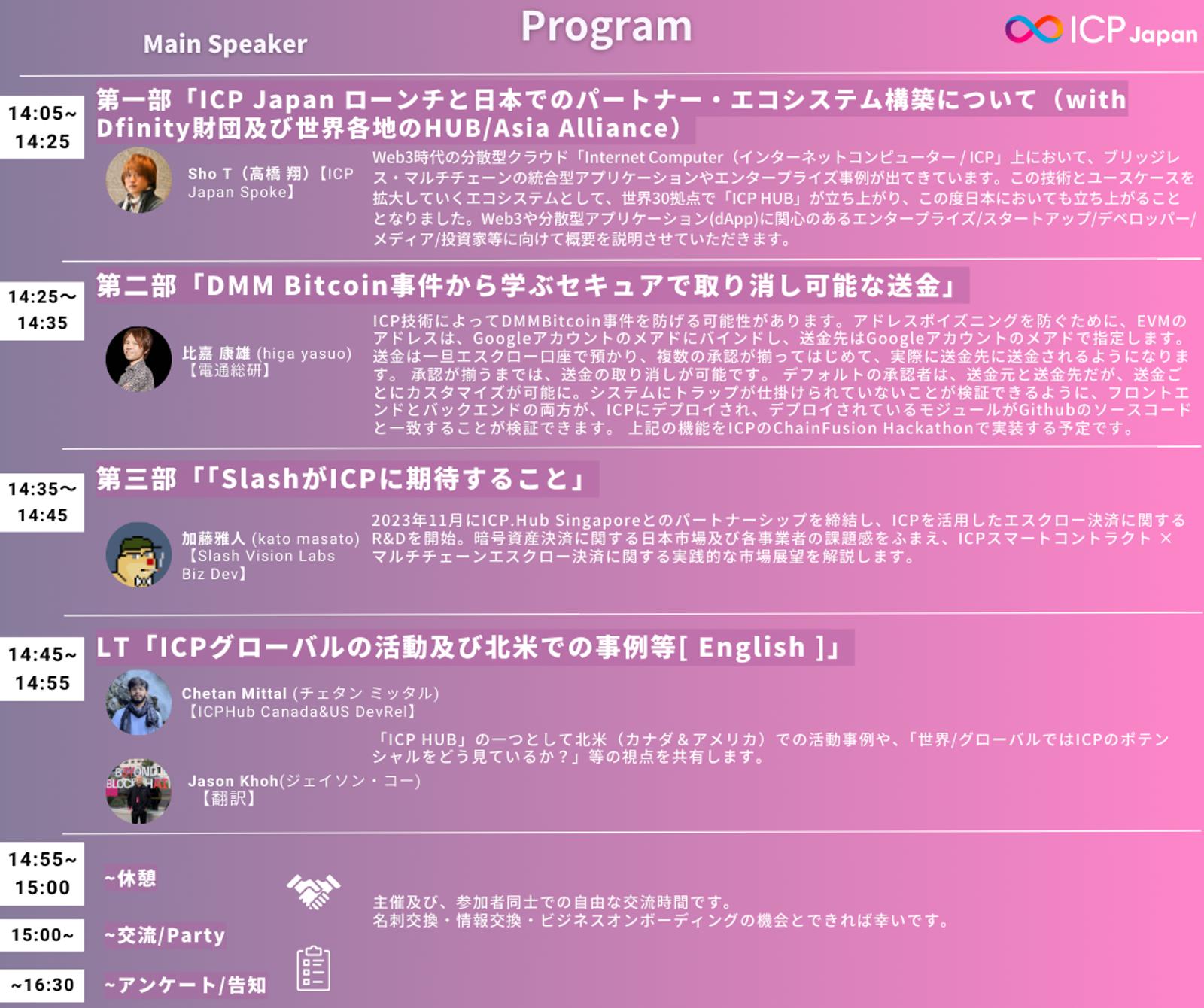 • 登壇内容:2023年11月にICP.Hub Singaporeとのパートナーシップを締結し、ICPを活用したエスクロー決済に関するR&Dを開始。暗号資産決済に関する日本市場及び各事業者の課題感をふまえ、ICPスマートコントラクト × マルチチェーンエスクロー決済に関する実践的な市場展望を解説します。