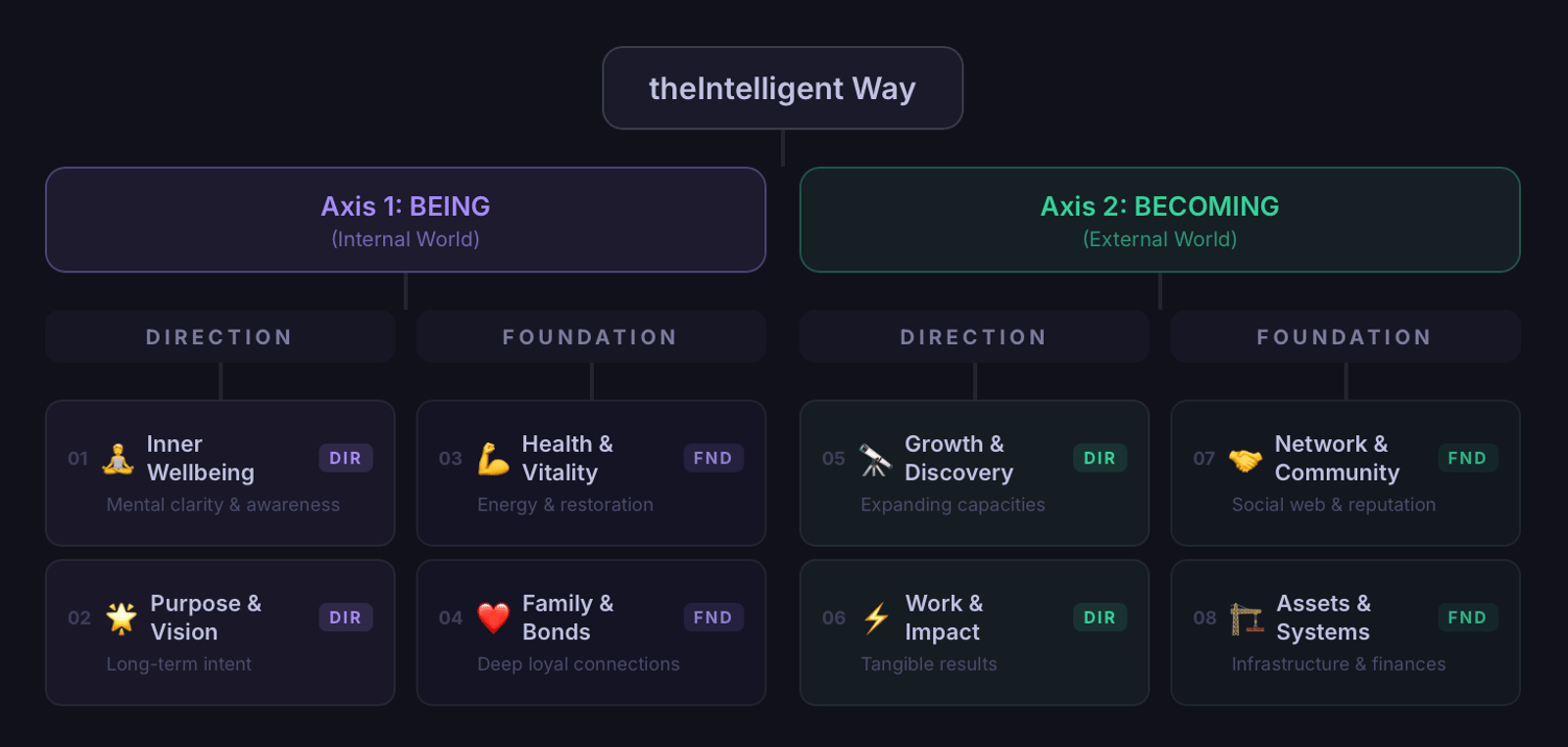 In our framework — theIntelligent Way — mission harmonizes all 8 aspects of your life. Not just work. Everything.