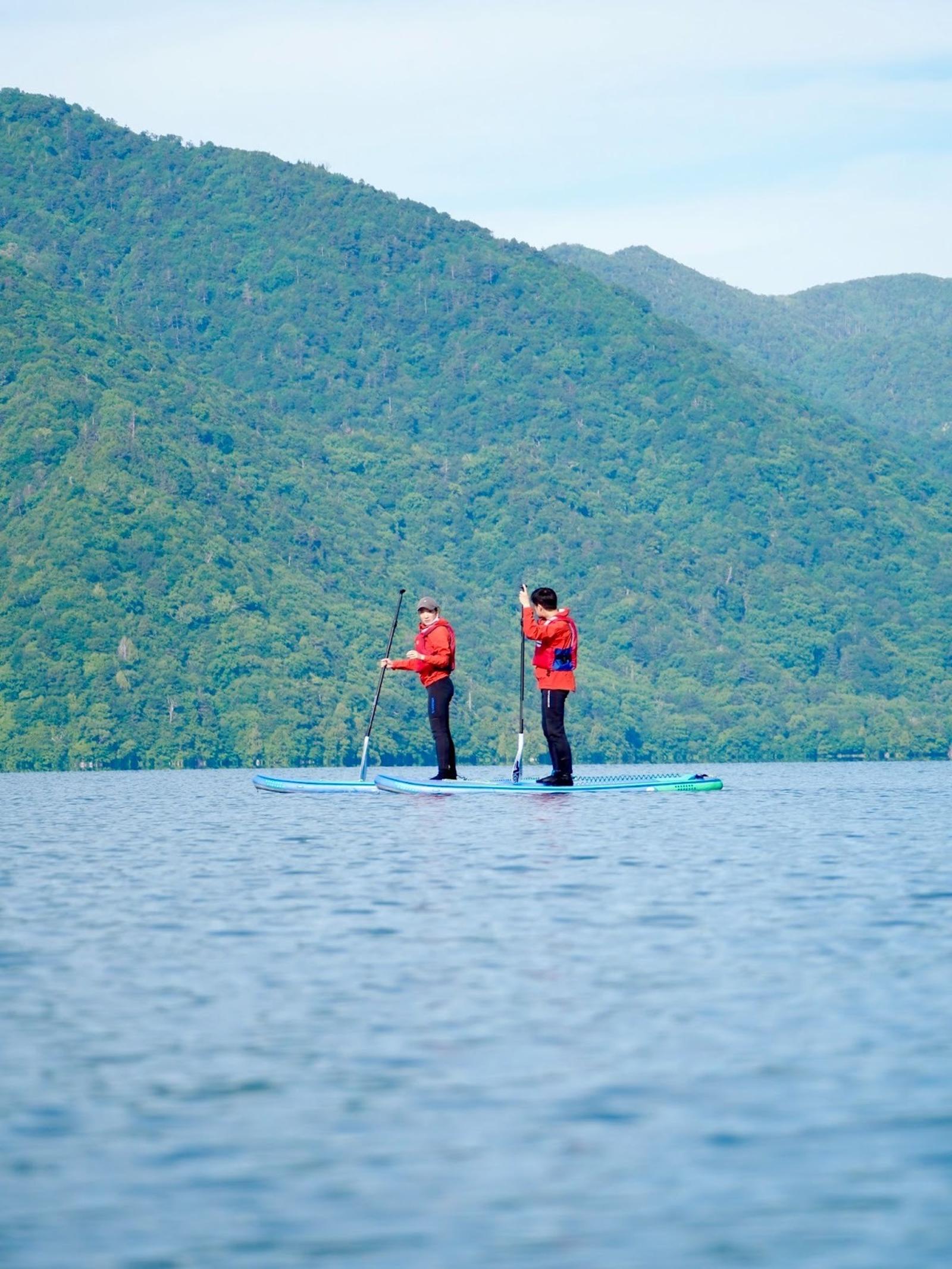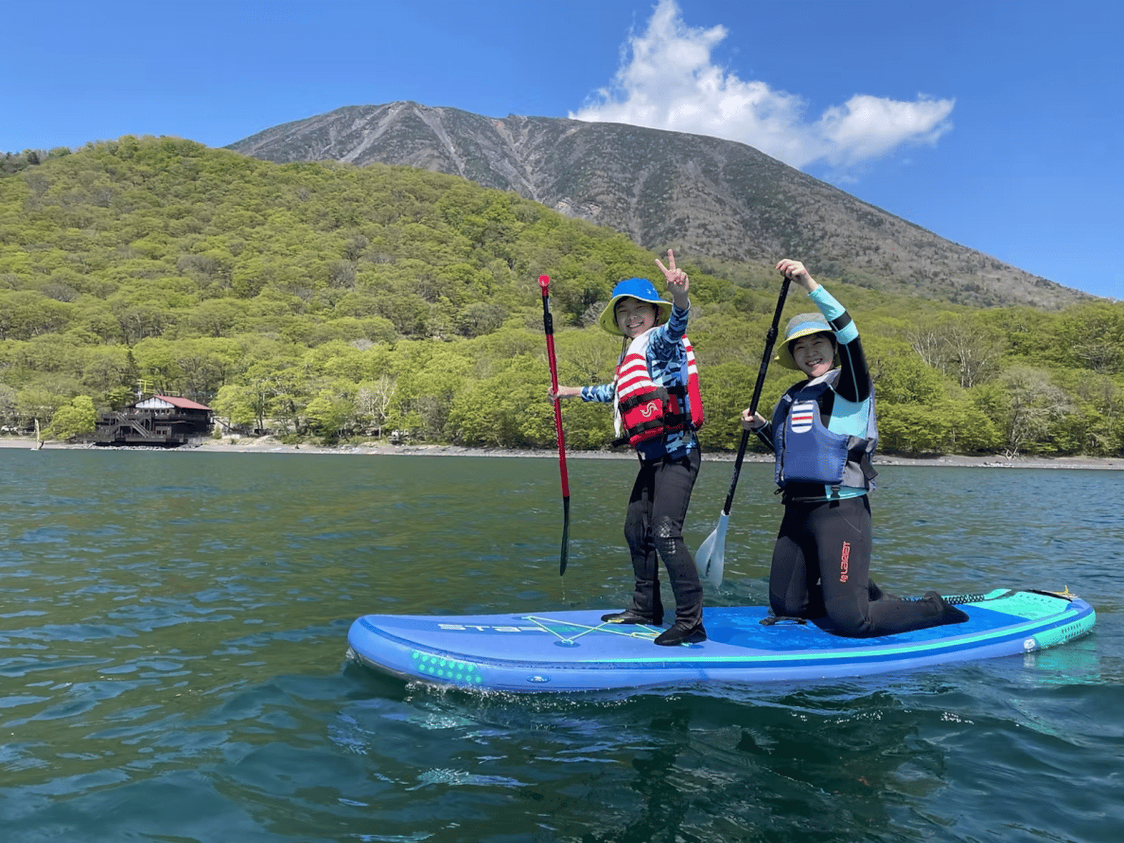 中禅寺湖でのSUP歴10年以上の経験豊富なインストラクターが丁寧に指導してくれるので、初めての方でも安心して参加でき、立った姿勢で漕いだり、ボードに寝てみたり、ヨガをしてみたり、技に挑戦してみたり!色々な楽しみ方をご提案します。
