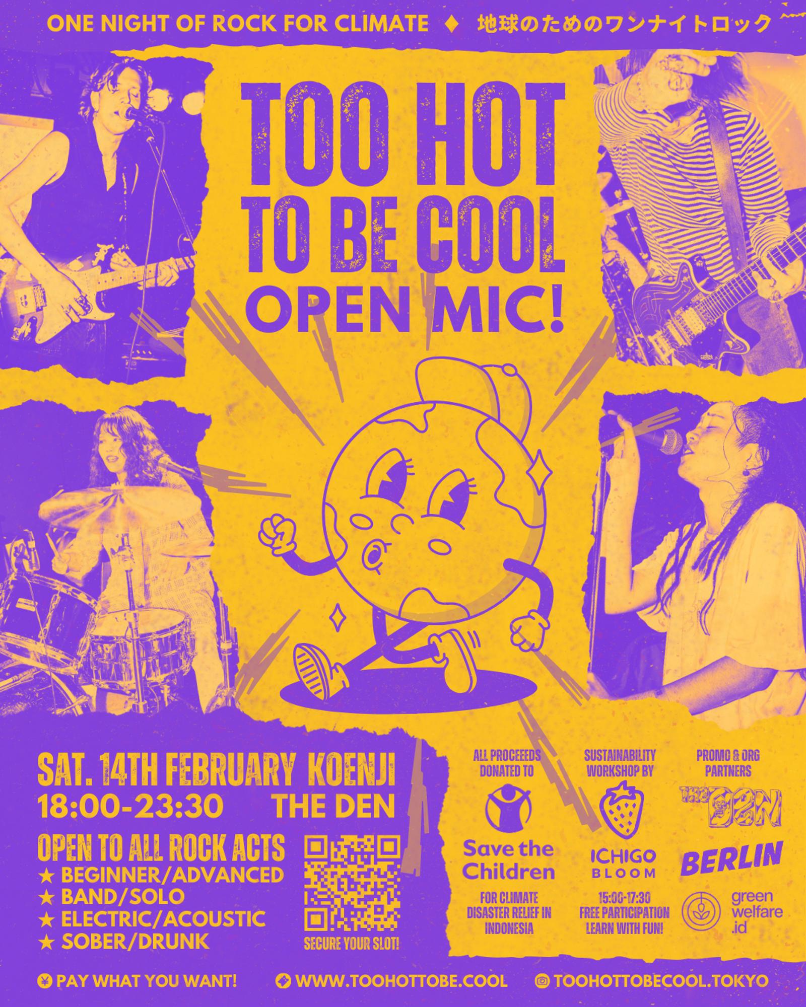 Since April 2024, Too Hot to Be Cool brings Tokyo's rock scene together to raise funds for youth-led environmental NPOs in Southeast Asia. Our first six editions have collected more than ¥1,000,000 for climate organizations in Thailand, the Philippines, Vietnam, Malaysia, and Indonesia.