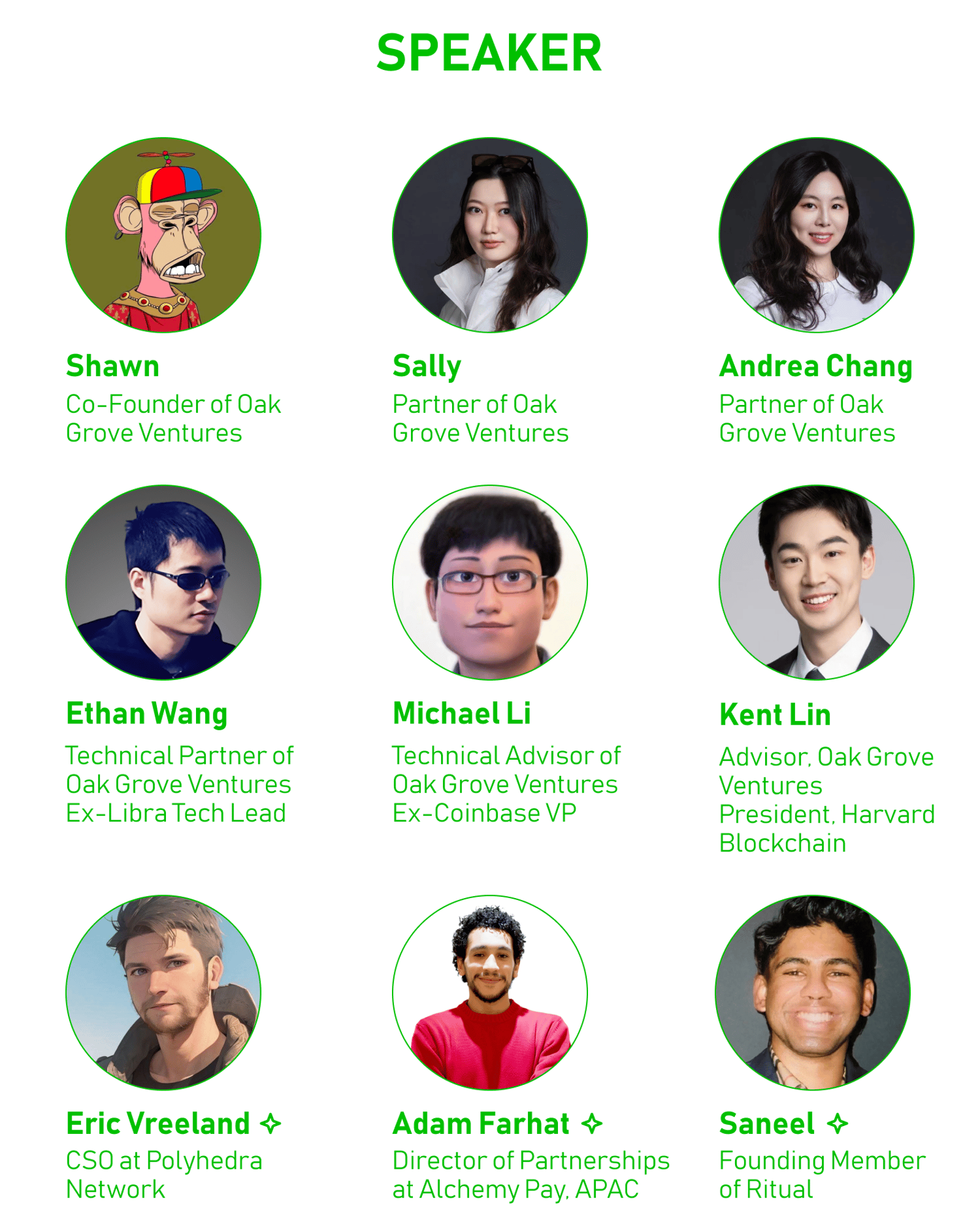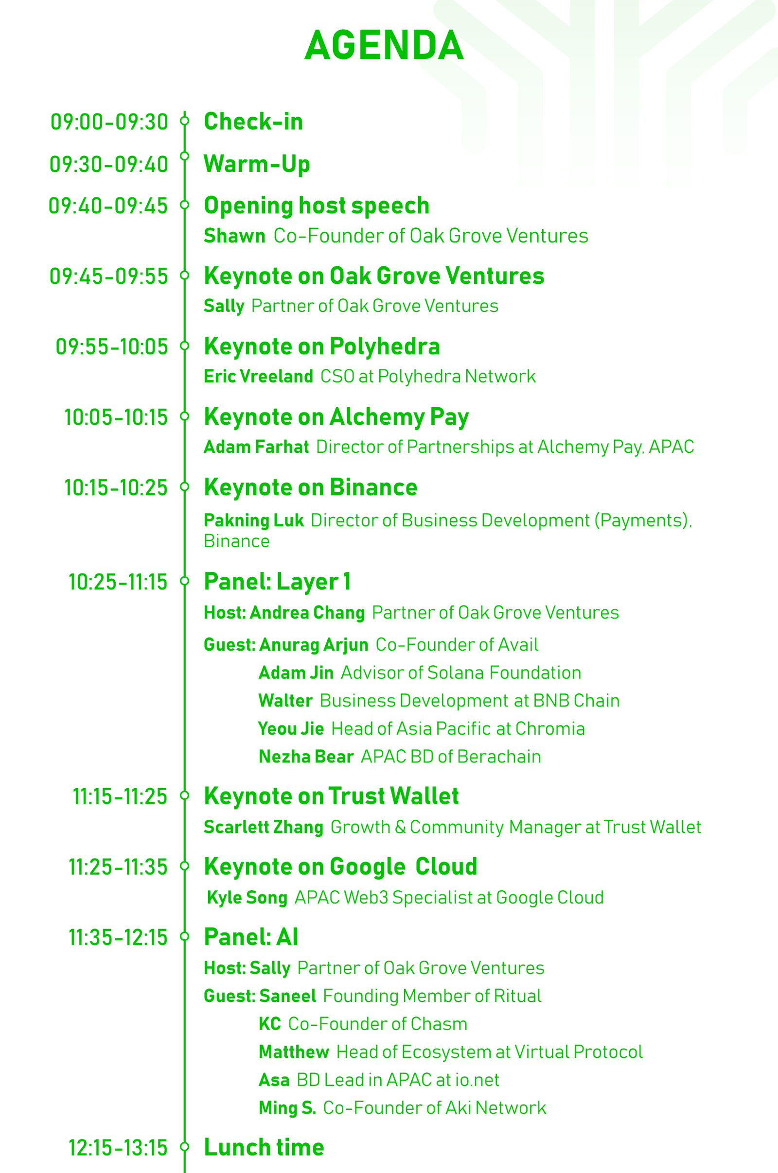 This year, Oak Grove Ventures is proud to feature an impressive lineup of leading projects and platforms that are at the forefront of the Web3 revolution, including Binance, CoinMarketCap, BNB Chain, Trust Wallet, TRON, Solana Foundation, NEAR Protocol, Gate.io, Tabi, OKX Wallet, Bitget Wallet, Manta Network, Neo, io.net, Merlin Chain, Lifeform, Delysium, IoTeX, BounceBit, UniSat, Chromia, Conflux Network, Bit.Store, Scallop, zkMe, OKX Ventures, Xverse, Avail, Virtual Protocol, Story Protocol, Tap Protocol, Network3, Bitlight Labs, Chasm, Reddio and Coinmaster.jp, as well as Amazon Web Services (AWS), Google Cloud and LaPay, highlighting the diverse and dynamic nature of the Web3 ecosystem.