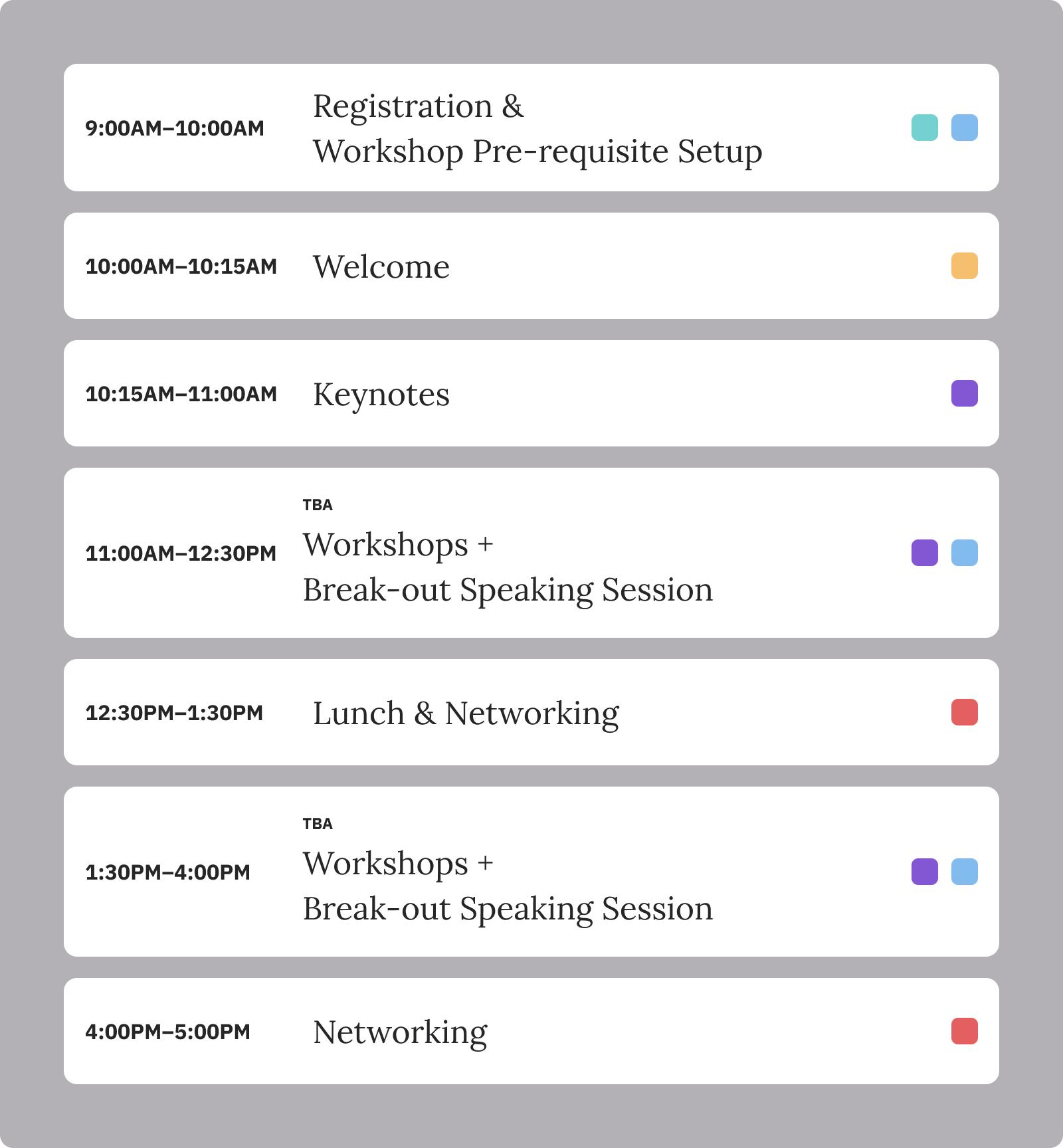9:00 AM–10:00 AM | Registration & Workshop Pre-requisite Setup Check in; bring your laptop to set up for the workshop. Grab a drink, enjoy light refreshments, and connect with fellow attendees before the program begins.
