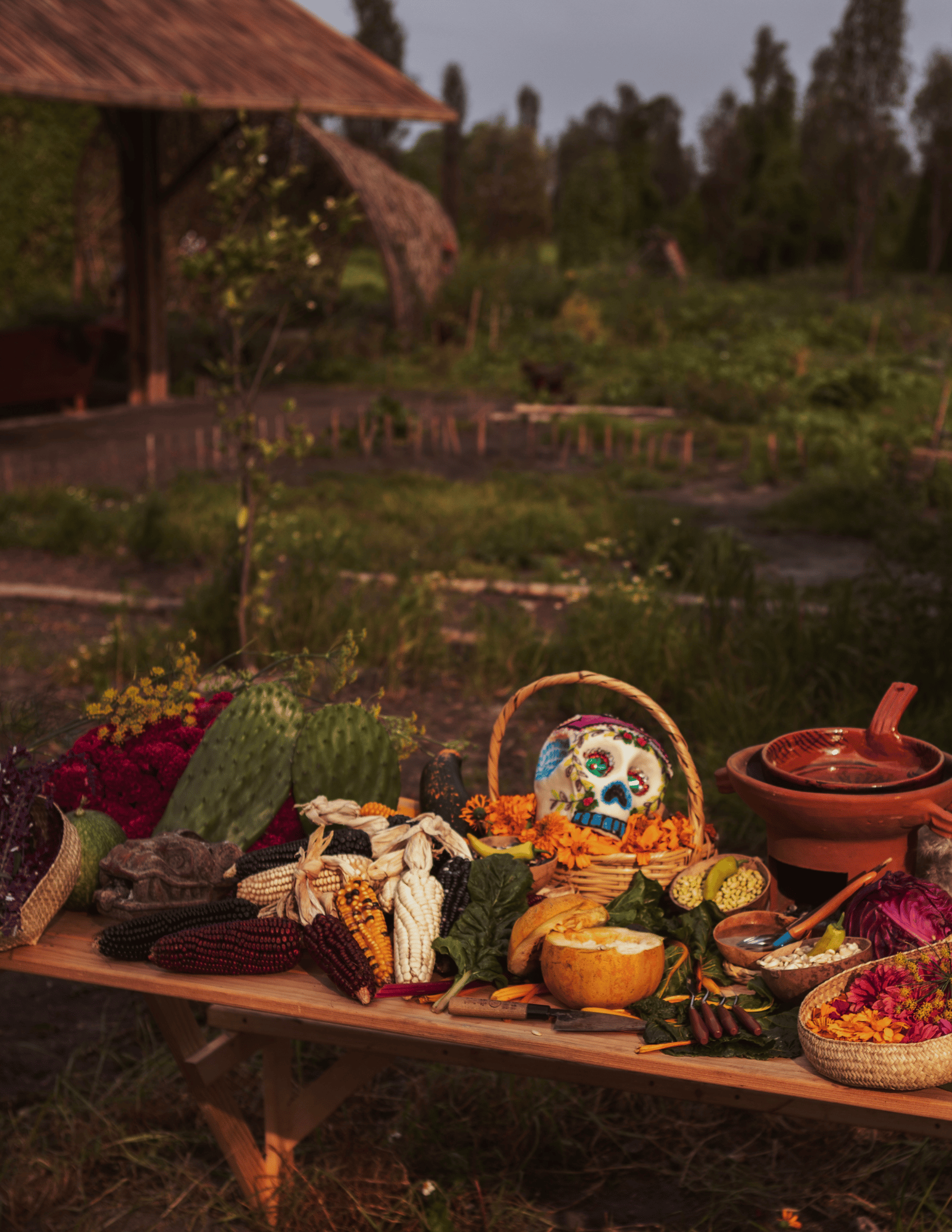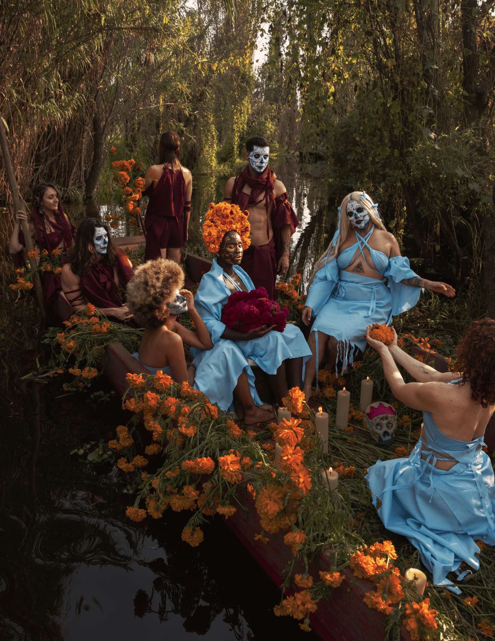 Cross the veil into the Land of the Dead - our OFRÆNDA journey takes the living through Mictlán on trajineras -floral floating altars- to the ancestral grounds of Xochimilco, at the Fuego Vivo chinampa.