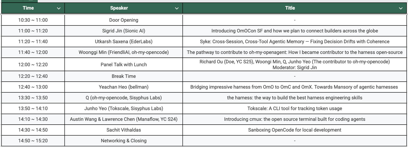 Contributor Talks — The people who built Oh My OpenCode present their work. Every major contributor gets the stage. Expect deep dives into agent architecture, edit tooling, MCP integration, and the real-world problems that shaped OmO.