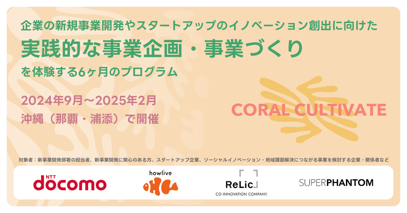 本プログラムは、株式会社NTTドコモ、株式会社マッシグラ沖縄タイムス、株式会社Relic、株式会社SUPERPHANTOMが共同で開催する、新規事業推進・スタートアップ創業のための実践プログラムです。内閣府の沖縄型スタートアップ拠点化推進事業費を活用しています。
