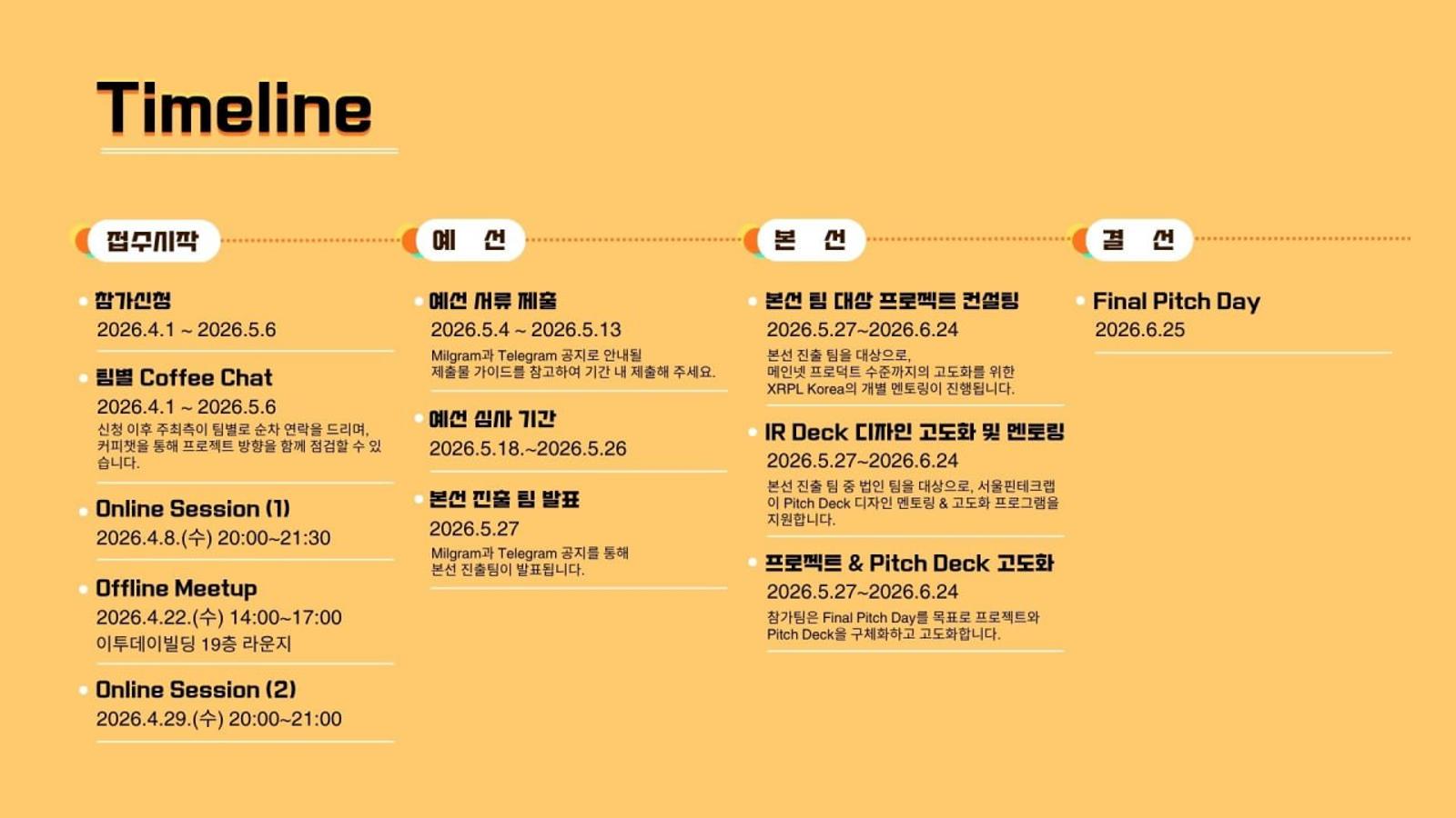 예선 → 본선 → 결선(Final Pitching Day) 순서로 진행됩니다.