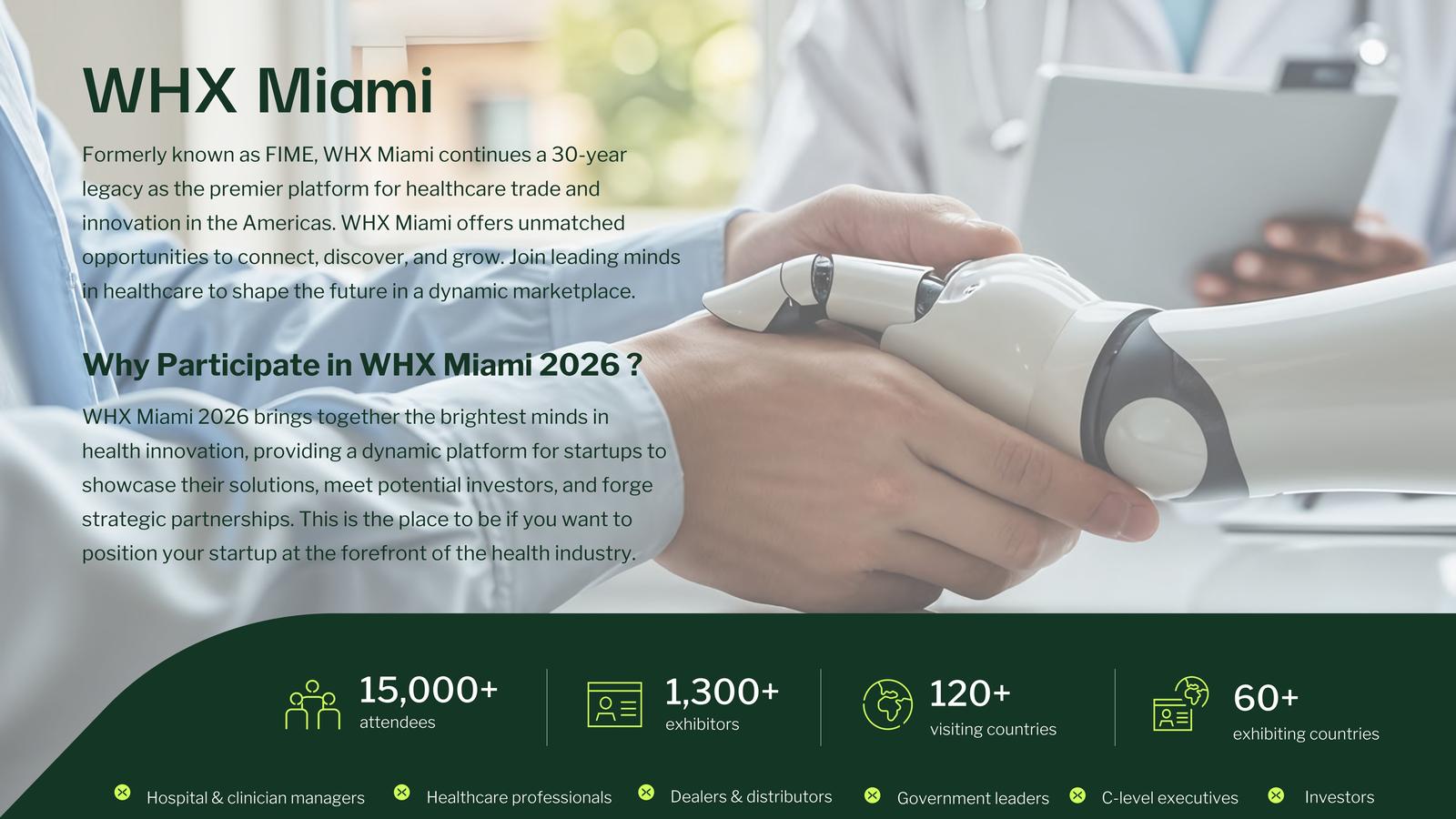 WHX Miami Formerly FIME is a global leader dedicated to advancing global healthcare by fostering connections, knowledge-sharing, and collaboration. As the largest medical technology trade show in the Americas, WHX Miami facilitates networking and idea exchange through its comprehensive programming. Through WHXMiami's network of over 10,000 exhibitors, 15 international events, 110 conferences, and year-round engagement, it unites over 600,000 healthcare professionals worldwide. By linking manufacturers, distributors, and practitioners, it empowers the industry to improve patient outcomes and drive progress in human health.