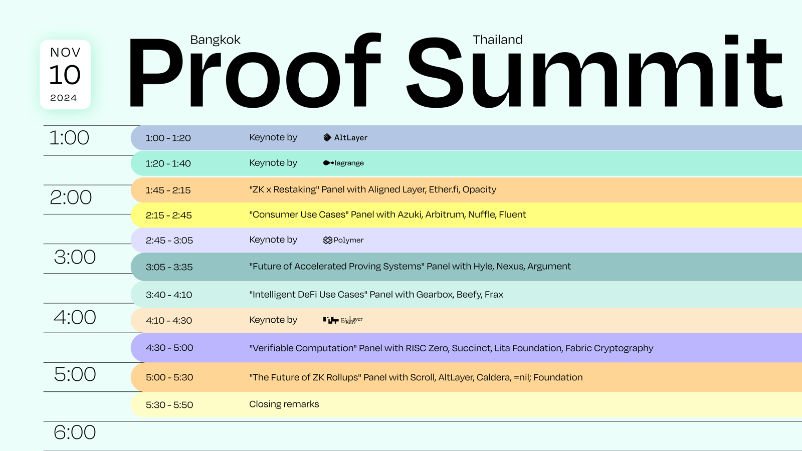 Co-hosted by Lagrange, EigenLayer, AltLayer, Polymer, and Hylé, Proof Summit will bring together industry leaders to explore the future of proving and real world use cases with ZK, restaking and interoperability.