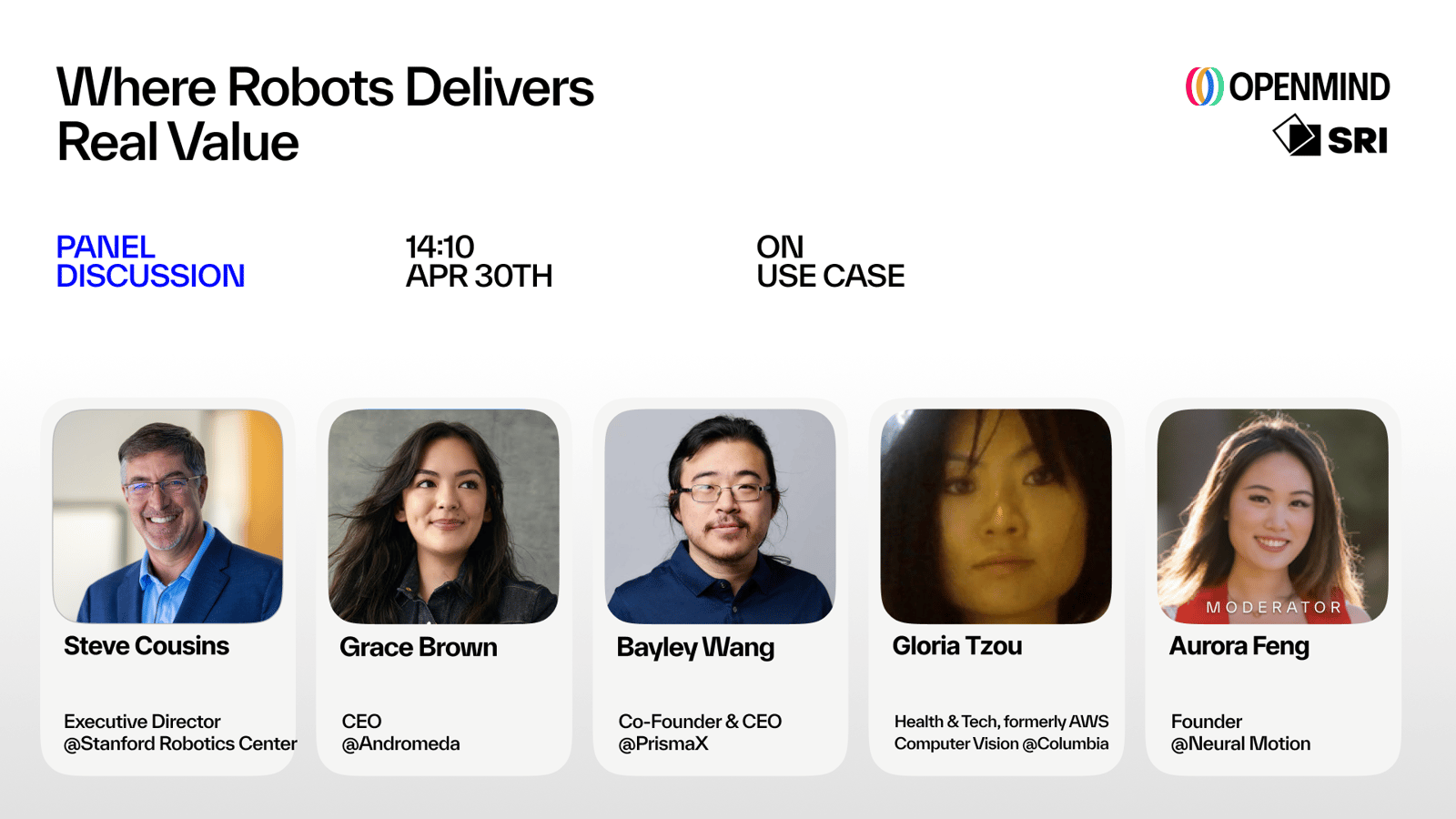 Speakers: Steve B Cousins from Stanford Robotics Center, Grace Brown from Andromeda Robotics, Gloria Tzou (Health & Tech, formerly AWS, Computer Vision @Columbia), Aurora from Neural Motion (moderator).