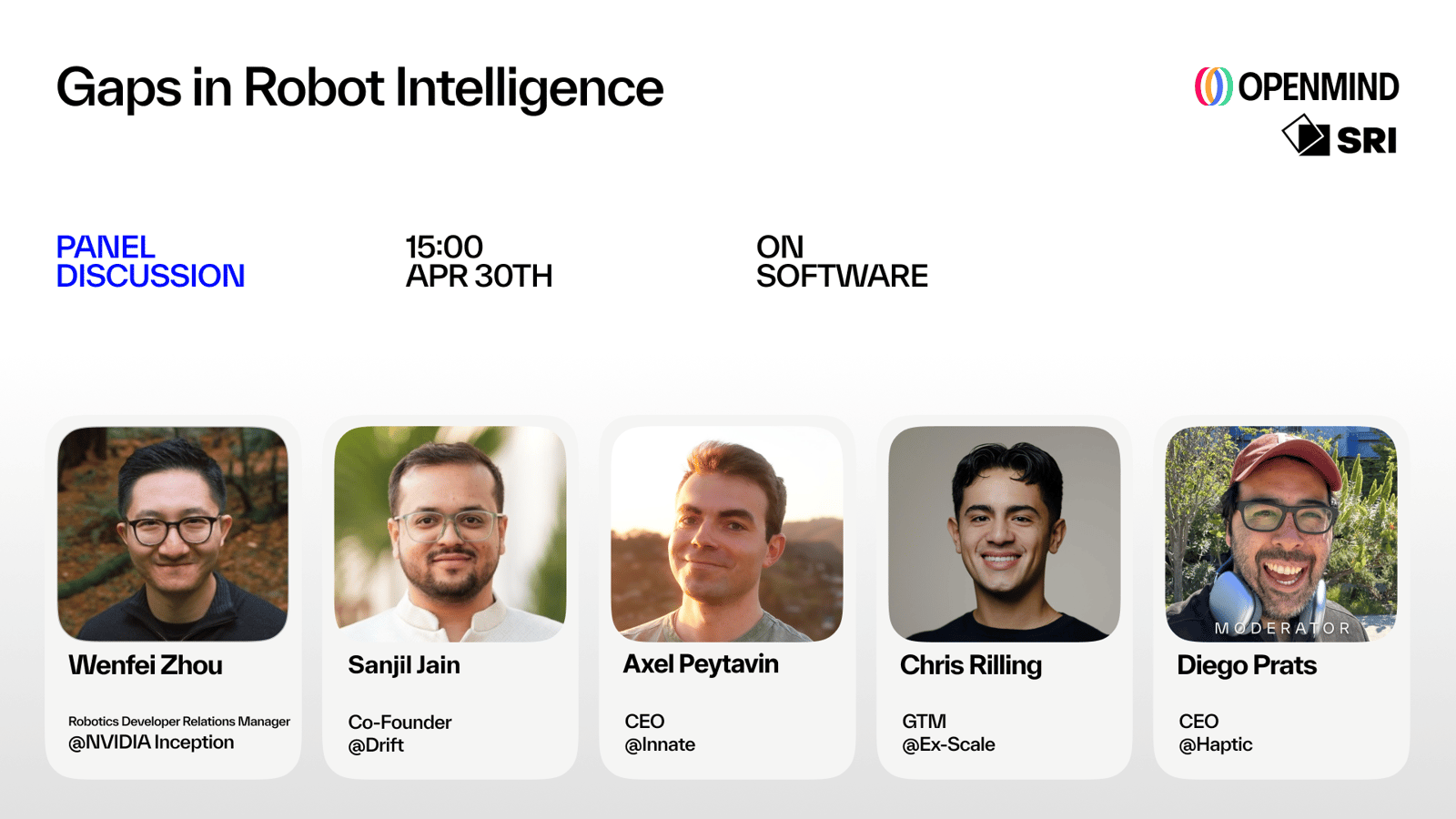 Speakers: Wenfei Zhou from NVIDIA Inception, Sanjil Jain from Drift, Axel Peytavin from Innate, Chris Rilling from Scale AI, Diego Prats from Haptic (moderator).