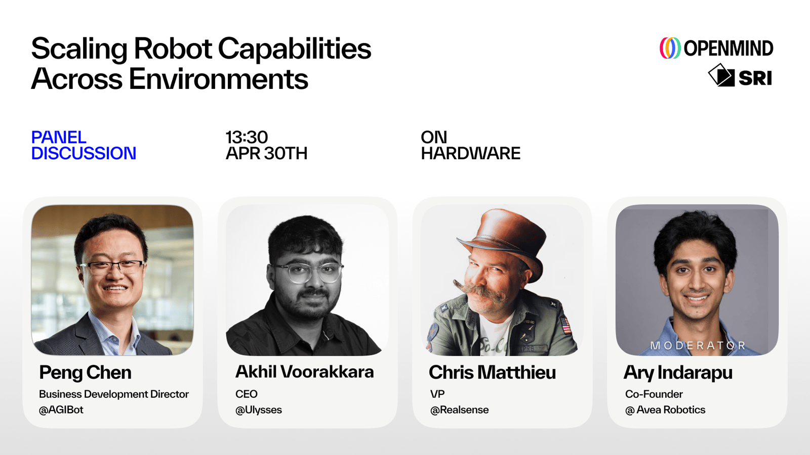 Speakers: Akhil Voorakkara from Ulysses, Peng Chen from AgiBOT, Chris Matthieu from Realsense, Ary Indarapu from Avea Robotics (moderator).