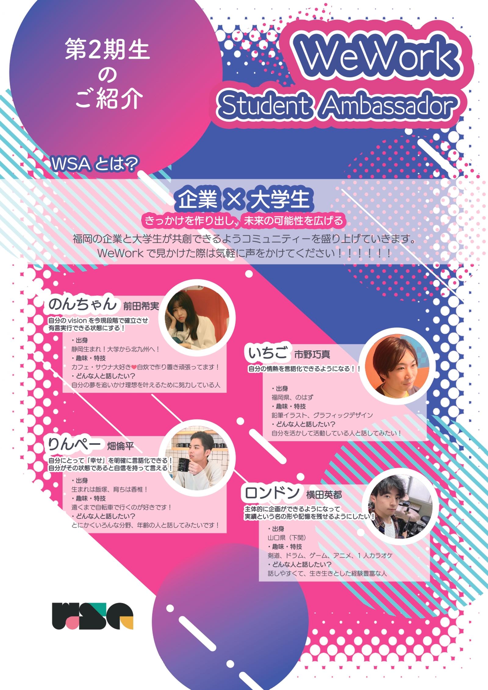 ​大学生と WeWork (米・ニューヨークで創業したフレキシブルオフィス)内の入居企業との接点を創り、学生と企業という壁を越えたコミュニティを醸造することを目的として2023年に有志で立ち上げました。福岡市内を中心にイベントを定期開催しています
