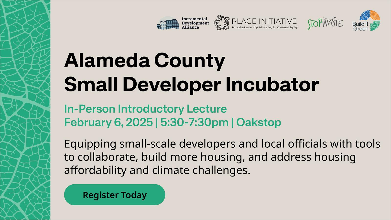 This one-hour introductory lecture followed by a period of Q&A is open to anyone interested in small-scale development, from experienced professionals to curious newcomers. It will introduce future training opportunities, answer questions, provide light networking time, and collect feedback on what’s needed in the Alameda County development landscape. IncDev Faculty will present core concepts of incremental development and facilitate connections among attendees.