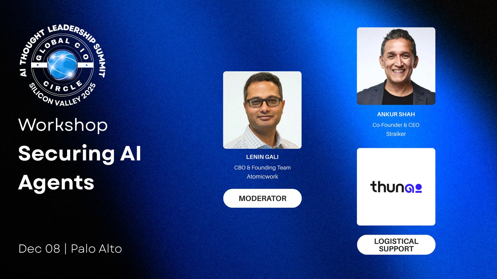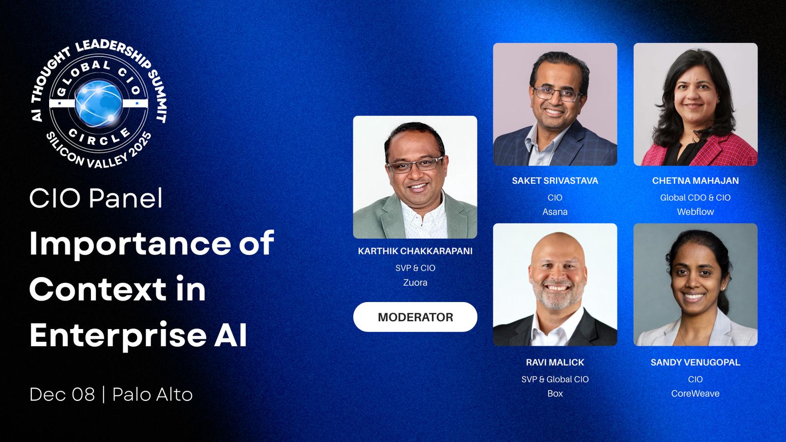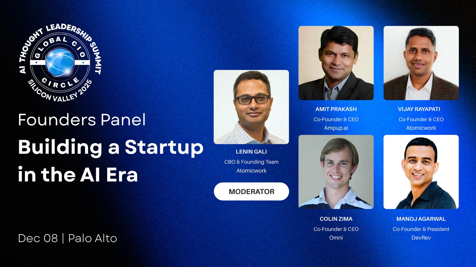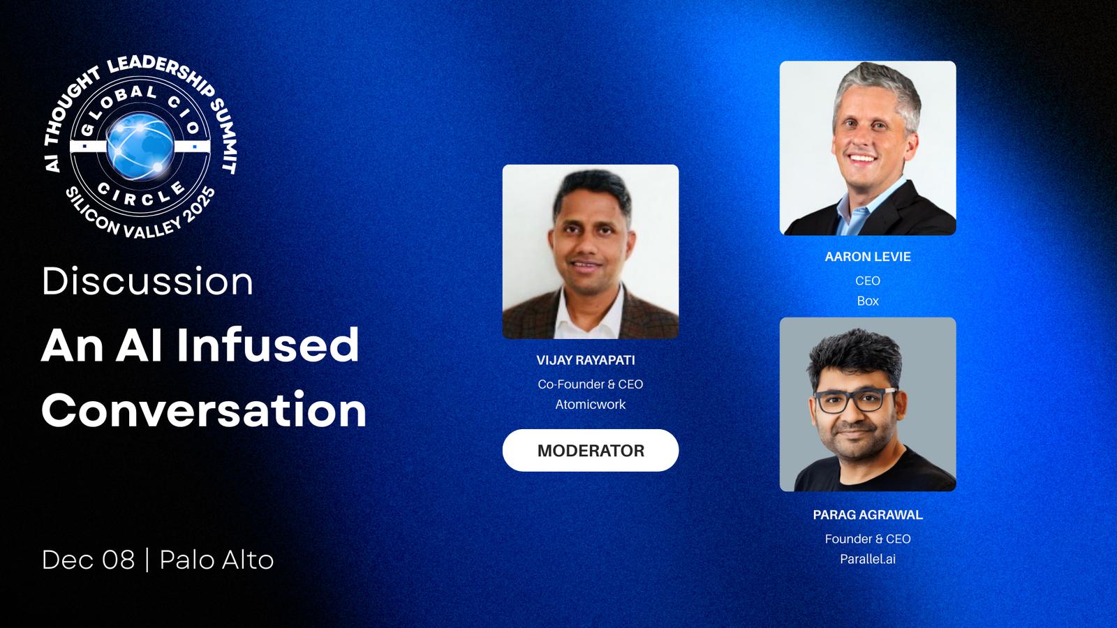 Atomicwork, in collaboration with Global CIO Circle, Okta Ventures, Tray.ai, a few startups, and several enterprises, is bringing this event to you. We are going to focus beyond surface-level conversations to explore the deeper purpose, mission, and vision of entrepreneurship, the problems and solutions being addressed, and building a global enterprise. Senior CxOs of multinational organizations - who lead large teams and navigate complex challenges - will share their wisdom, insights, and lessons learned working with AI. In doing so, they provide founders and executives with guidance, perspective, and practical advice to help accelerate growth and achieve 10x outcomes.