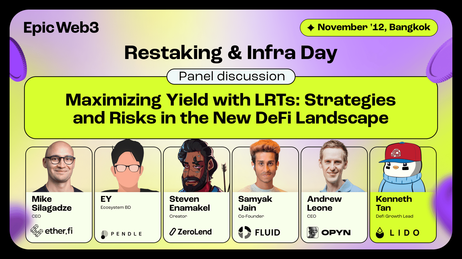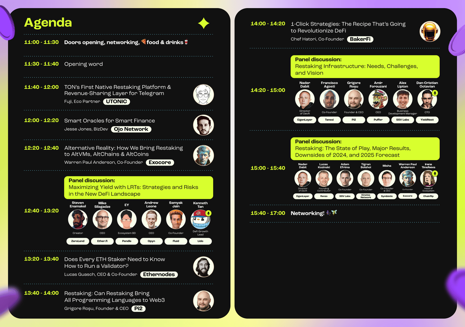 Speakers from Eigen, Ether. fi, Pendle, Symbiotic, Puffer, Renzo, Lido, Ethernodes, Pi2, ZeroLend, Tanssi, BakerFi, SSV Network, Exocore, Fluid, Kinetex Network, Ojo, Chainflip, YieldNest, Opyn, Utonic.