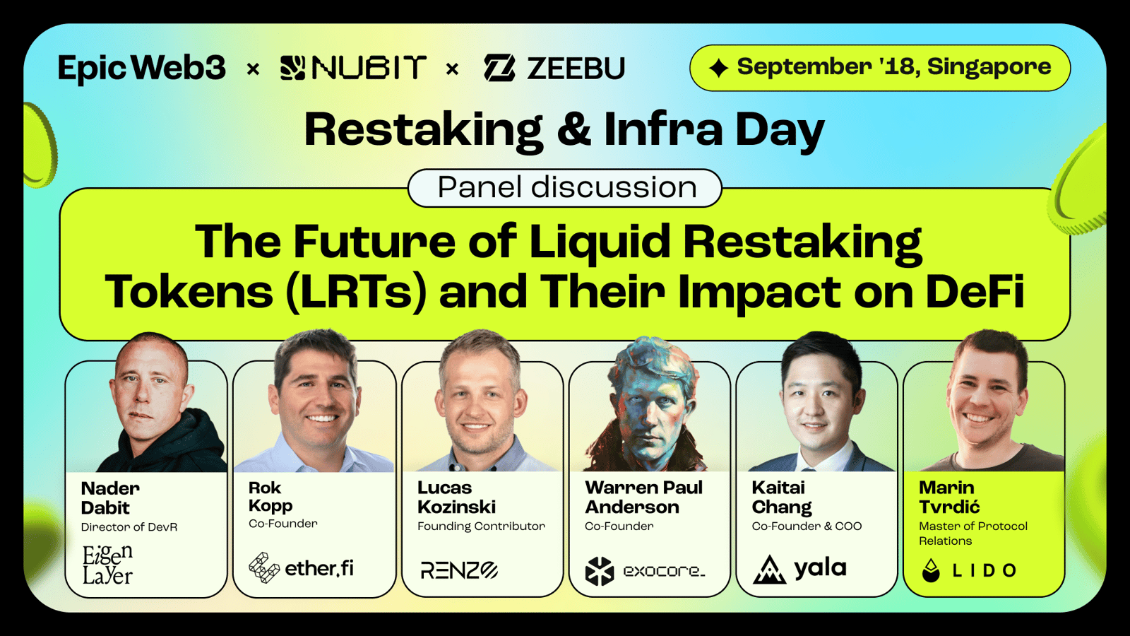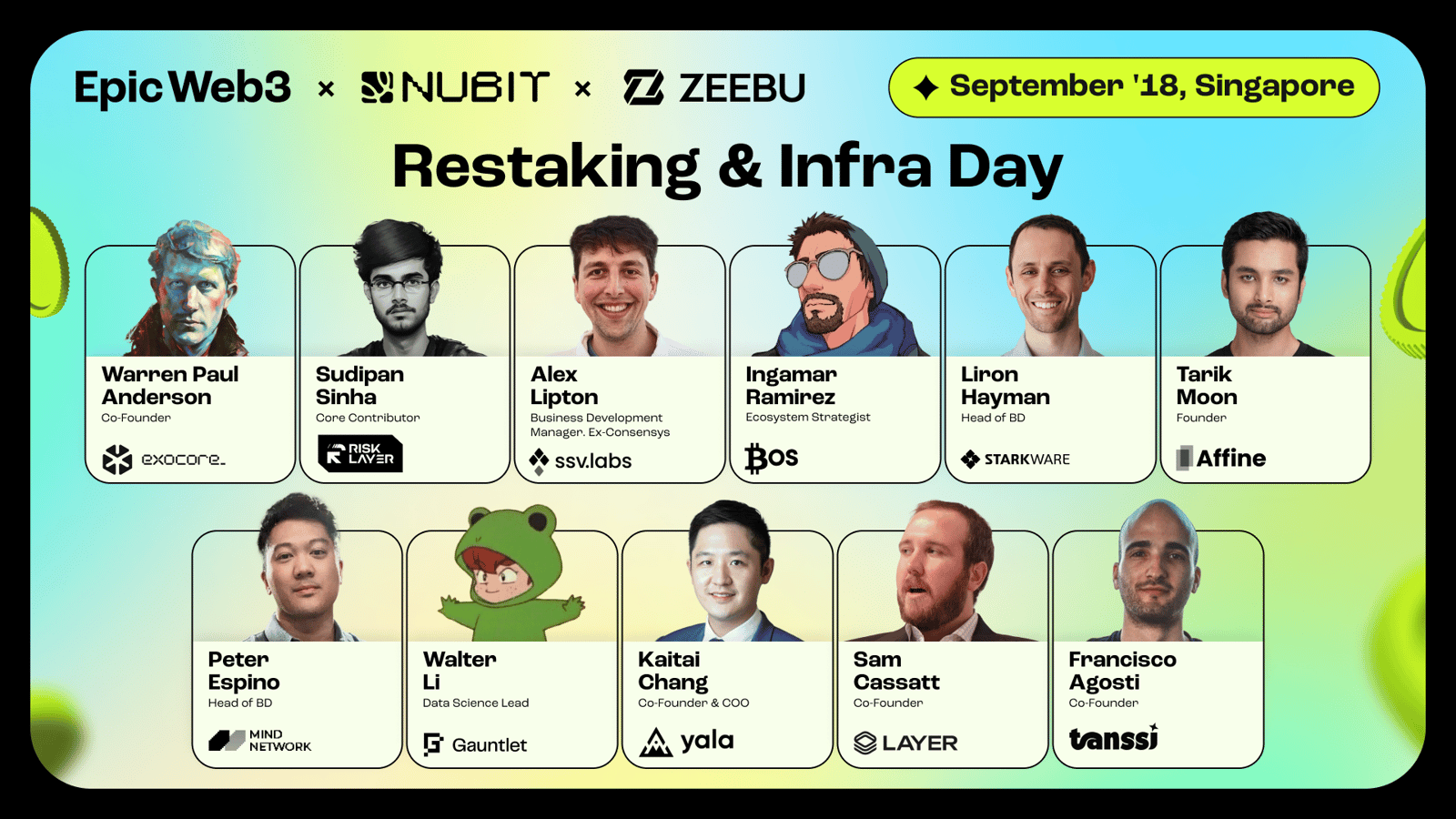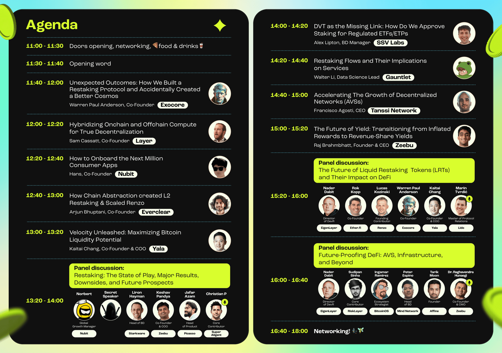 Speakers from Eigen, Karak, Picasso, Renzo, StarkWare, Zeebu, Nubit, Lido, Yala, Exocore, Everclear, RiskLayer, SSV Network, Bitcoin OS, Mind Network, Affine, Super Alignment, Gauntlet, Layer, Tanssi.