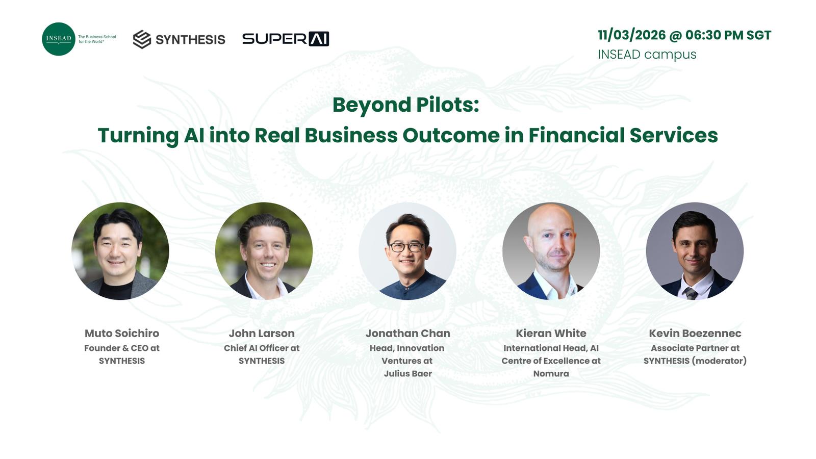 This executive-level forum is co-designed by SYNTHESIS, in partnership with INSEAD and SuperAI, to bring together senior leaders from financial services and technology.