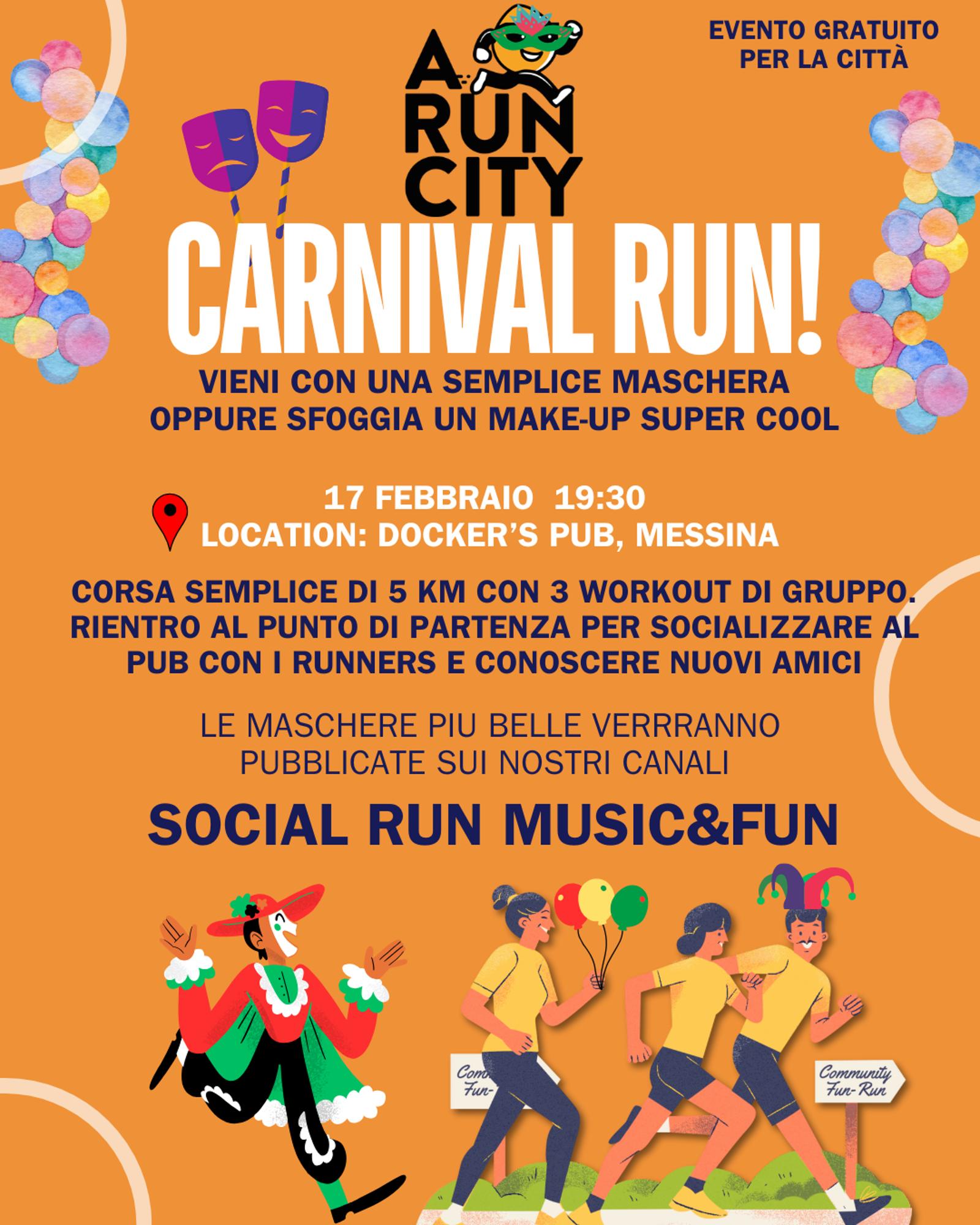 Evento gratuito! Ci ritroviamo Martedì 17 Febbraio al Dockers Pub alle 19:30 per un appuntamento speciale: la nostra social run a tema Carnevale.