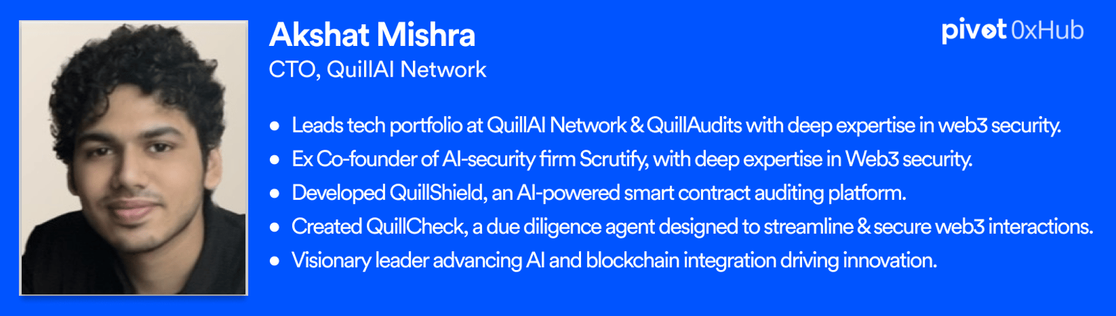 Akshat is the CTO of QuillAudits and the brains behind the QuillAI Network. With extensive expertise in Web3 security and AI, he previously co-founded the AI security company Scrutify. At QuillAudits, Akshat leads the development of groundbreaking solutions like QuillShield, an AI-powered smart contract auditing platform, and QuillCheck, a due diligence agent, both part of the QuillAI Network.