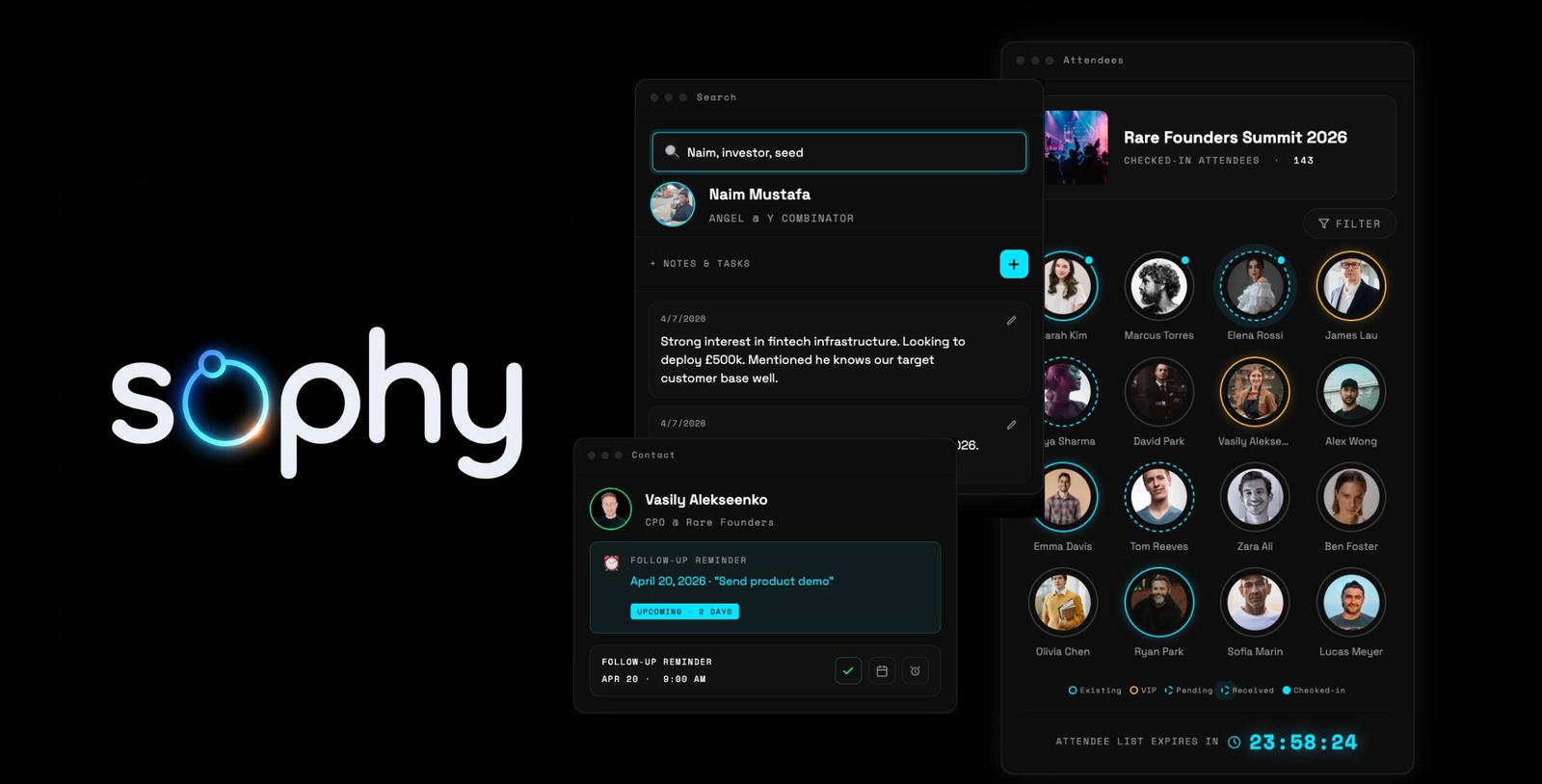 Meet Sophy - your networking companion designed to make every connection count. Built for founders, investors, and operators, Sophy helps you see who’s in the room, add notes to your contacts, set follow-ups, and instantly search your entire network - so no valuable connection ever slips through the cracks. Join the waitlist now to be one of the first to benefit from it: GetsophySoPhy — Never Lose a Contact Again