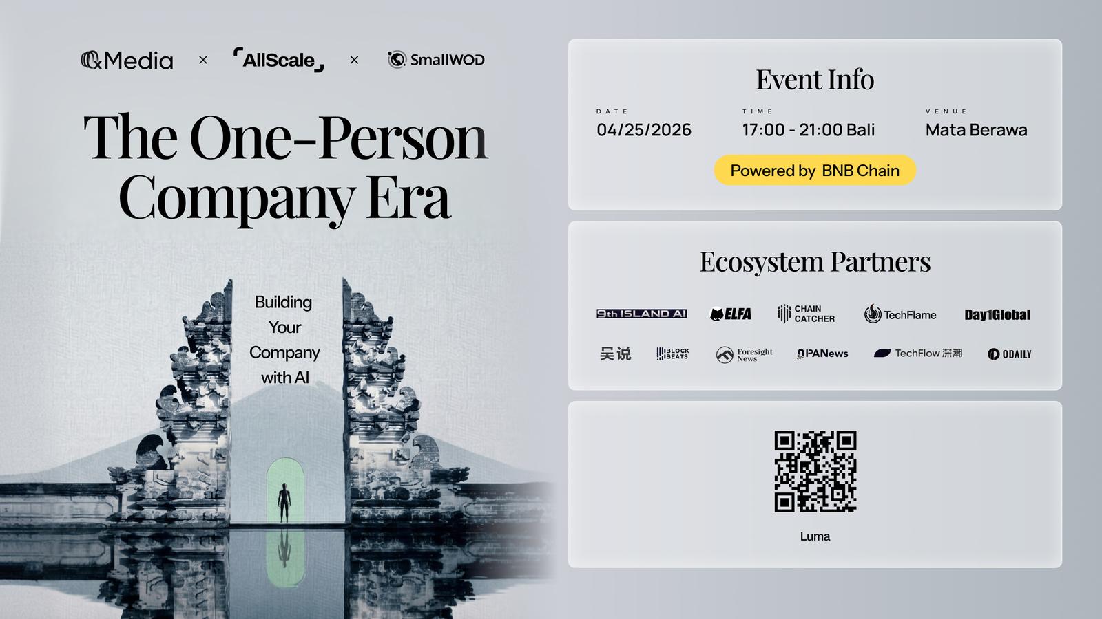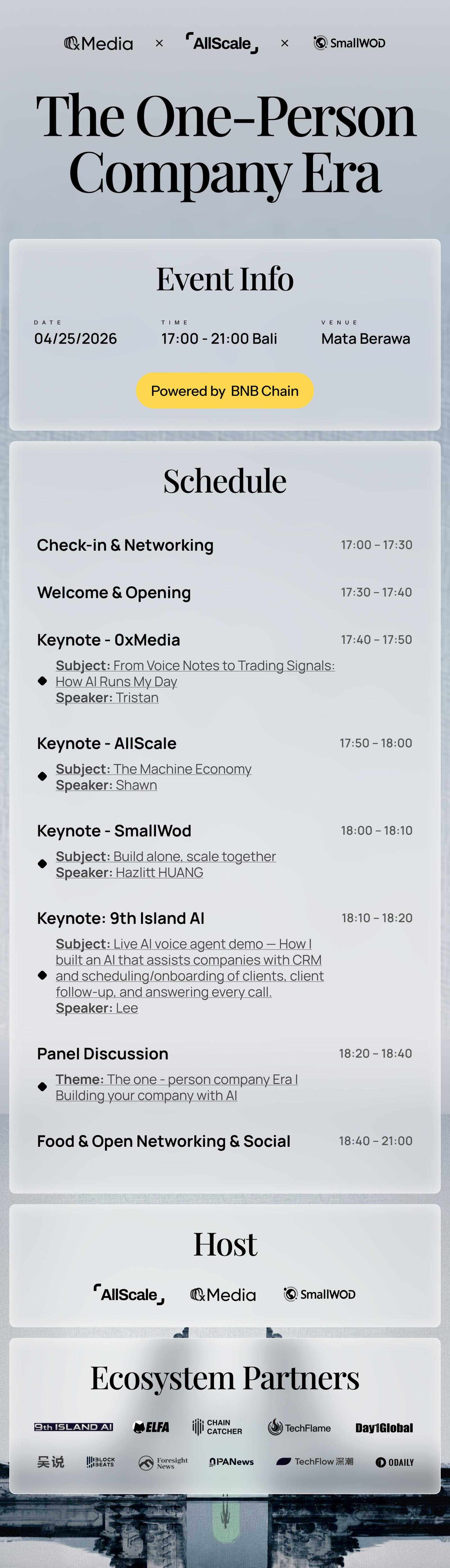 Join AllScale ,SmallWod and 0xMedia at the stunning Mata Berawa in Bali. We are gathering the world's leading AI builders, Web3 architects, and visionary founders to deconstruct the blueprint of AI-driven enterprises and the decentralized infrastructure making it all possible.