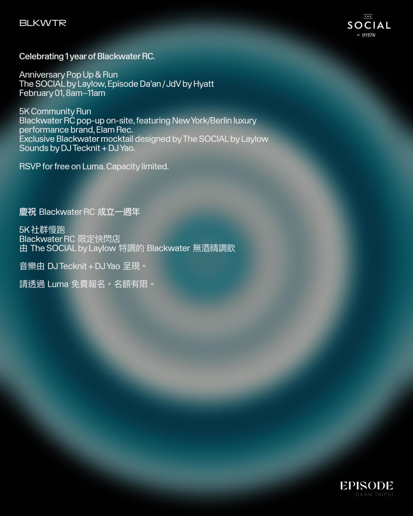 Following the run: Blackwater RC + Elam Rec pop-up on-site. Exclusive Blackwater mocktail by The SOCIAL by Laylow. Sounds by DJ Yao and Tecknit. A shared morning to mark a year of showing up.