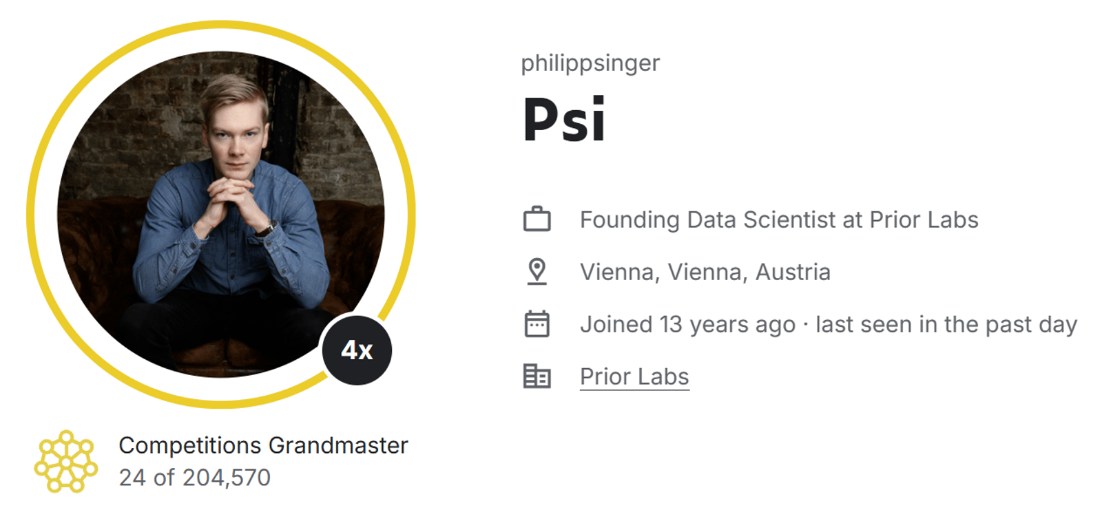 Philipp Singer from Prior Labs will join us to give a talk and lead a workshop on TabPFN. Philipp is highly regarded within the Kaggle and broader machine learning community. As a Kaggle Grandmaster (and former #1 in competitions), his expertise and insight are truly world-class. I’ve also had the pleasure of working with Philipp in the past, and it’s fantastic to collaborate with him again.