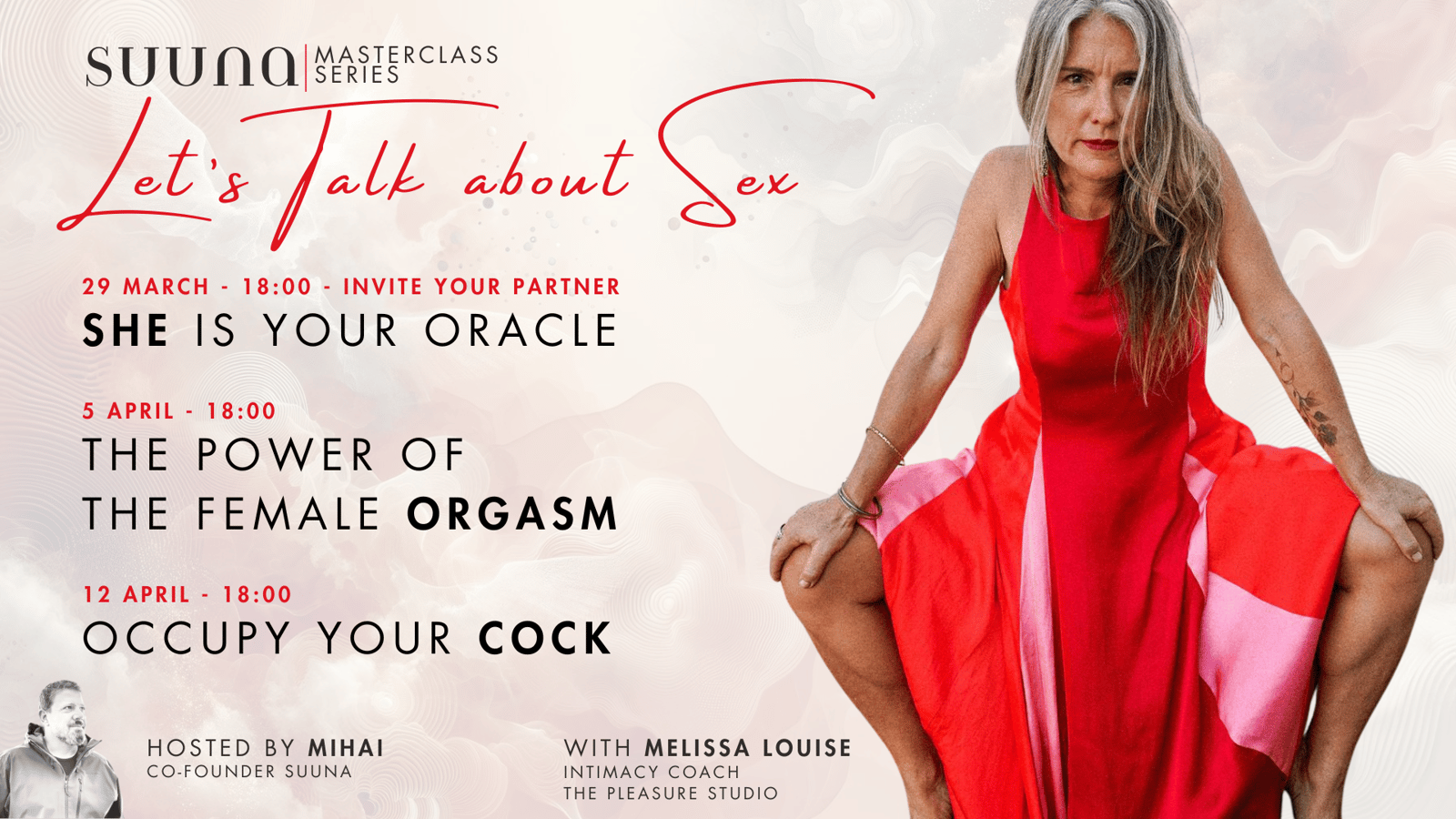 This 2h online event on Zoom is one part of "Let's talk about SEX" 3-part SUUNA Masterclass with Melissa Louise, intimacy coach at The Pleasure Studio.