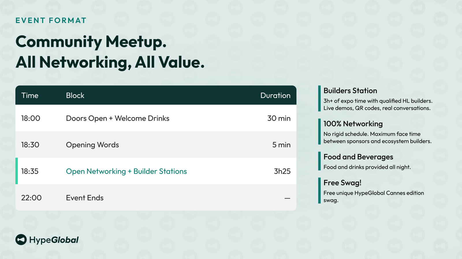 🕕 18:00 ·Doors Open + Welcome Drinks 🕡 18:30 ·Opening Words 🕖 18:35 ·Open Networking + Builder Stations 🕙 22:00 ·Event Ends
