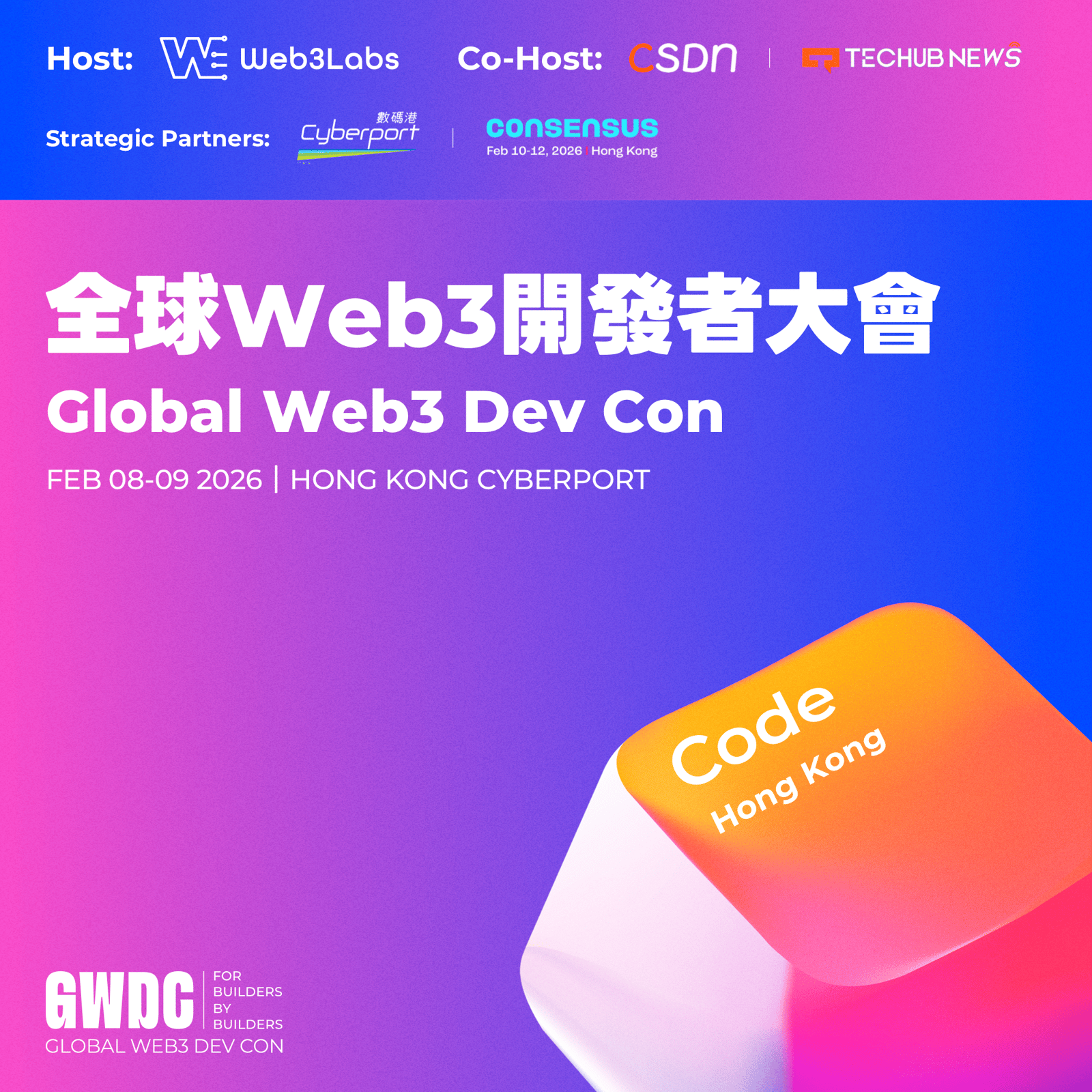 🚀亞洲首屆開發者導向Web3盛會即將登陸香港!由Web3Labs主辦的全球Web3開發者大會2026(Global Web3 Dev Con)將於2026年2月8-9日(2天)在香港數碼港(Cyberport)舉行,作為Consensus Hong Kong 2026官方大型邊會,聚焦For Builders, By Builders,匯聚1000+ Web3愛好者與300+頂尖開發者,深度coding與創新交流。
