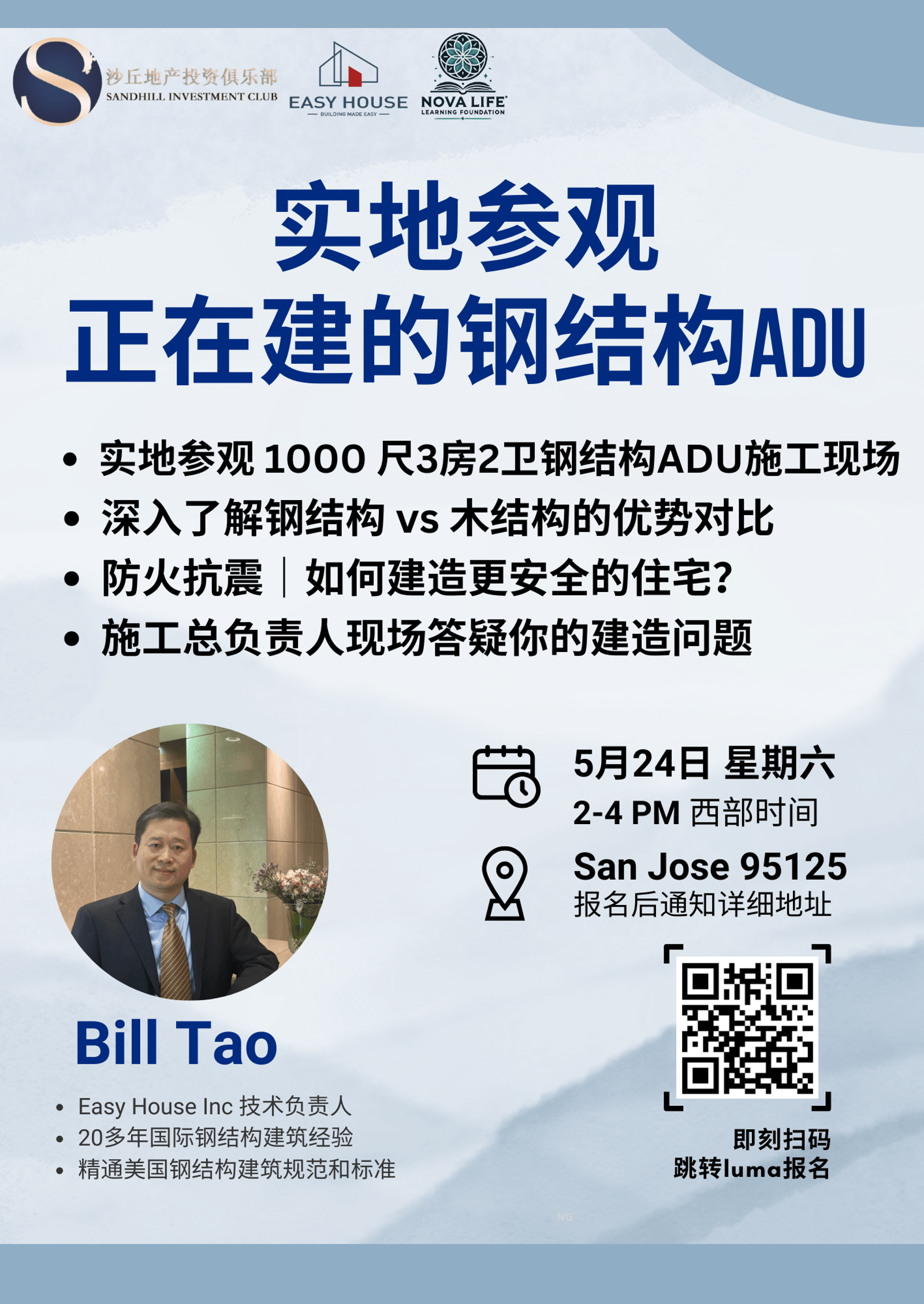 ✅ 与我们的钢结构专家/建房技术总负责人 Bill Tao面对面交流,了解木结构和钢结构建房的区别,如何建造防火抗震的安全房屋!