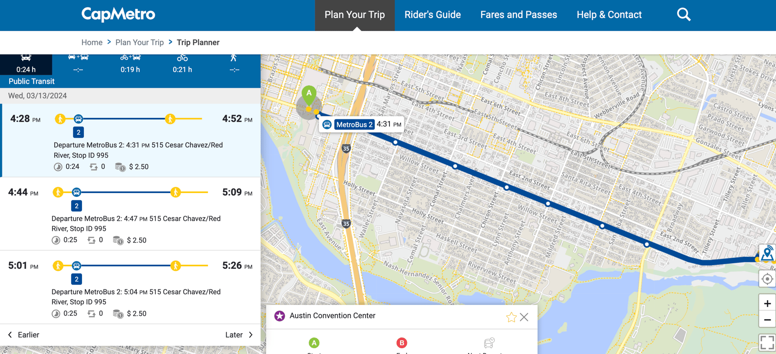 Getting to Palm Ventures from the Convention Center area is pretty easy via bus or even scooter. It's a 20 minute direct ride on CapMetro route #2 - 7 stops down Cesar Chavez. Buses run ever 15 minutes.