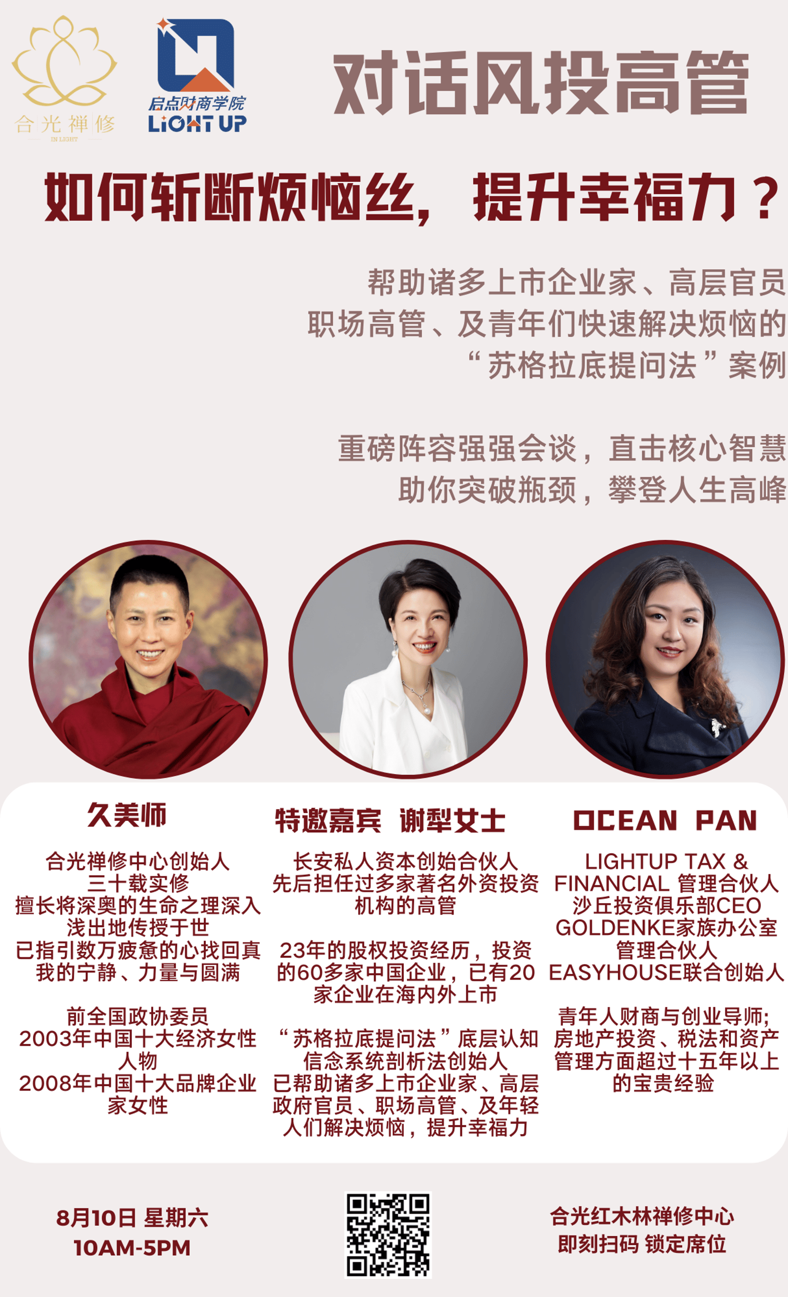 在此次合光一日禅中,我们非常荣幸地请到了资深风险投资人谢犁女士与久美师对话,她将分享她独创的“苏格拉底”式提问法以快速解决人生烦恼的案例,她的这套方法已帮助诸多上市企业家、高层政府官员、职场高管、及年轻人们解决烦恼,提升幸福力。