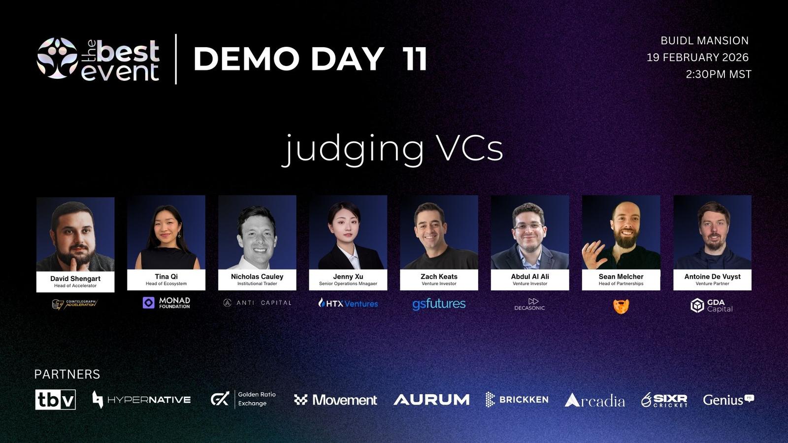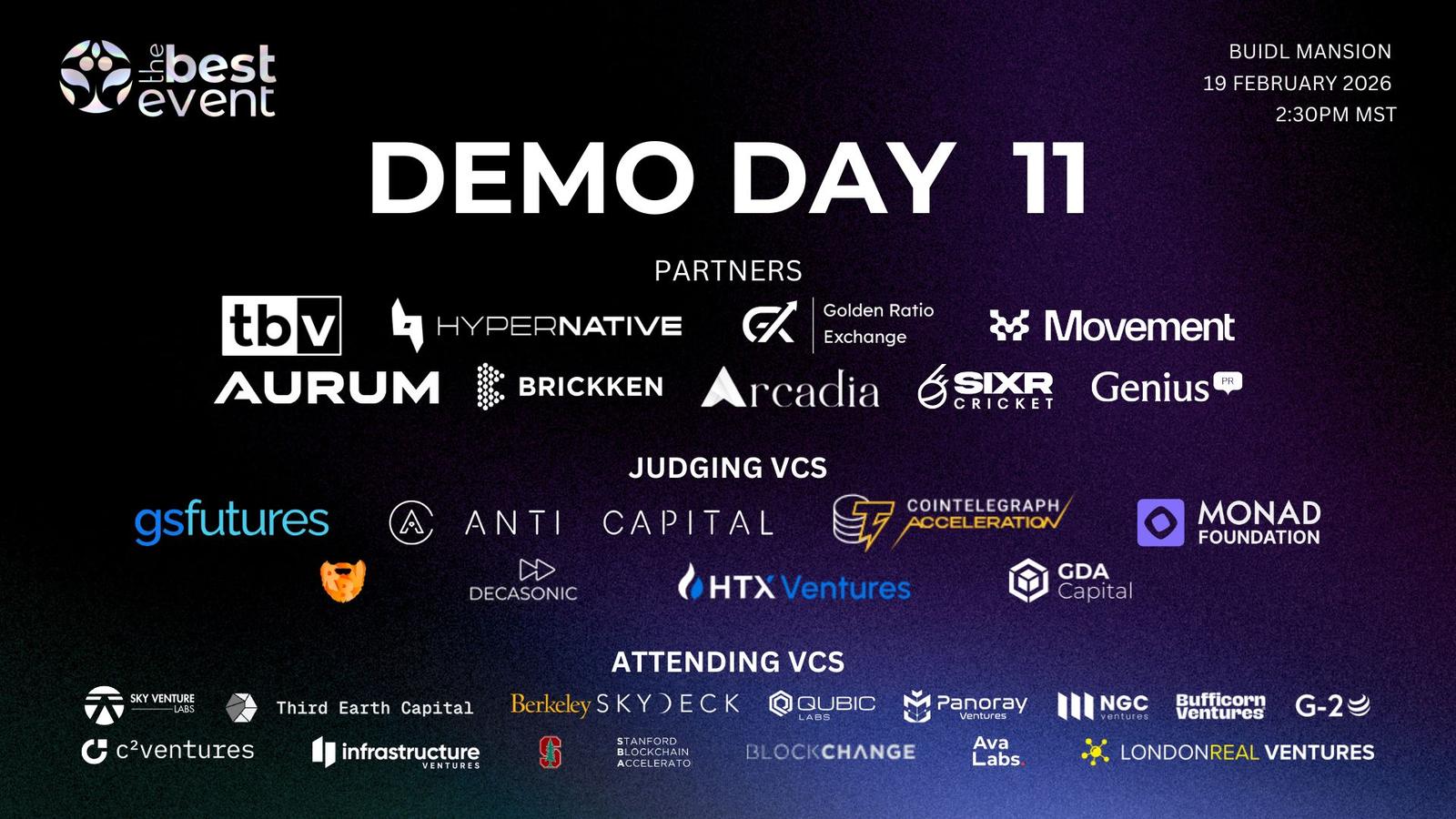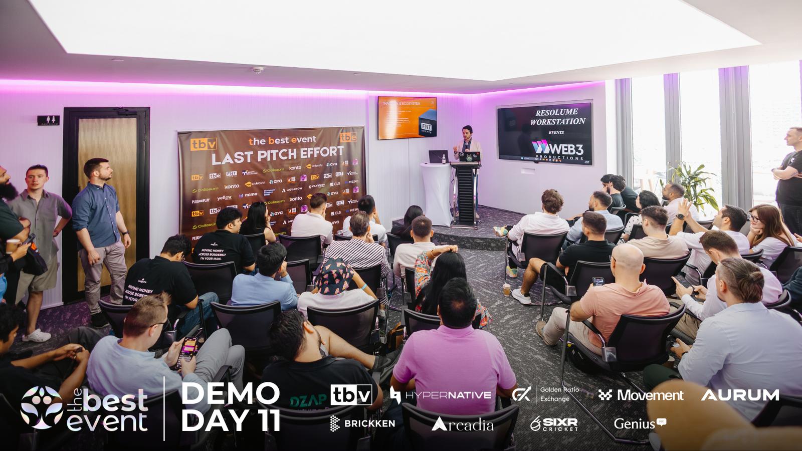 βJoin us at the TBV Demo Day #11, where selected crypto and web3 founders will be under the pump to pitch their projects in 2 minutes, live and in person at The Best Event's private mansion in Denver. If youβre a blockchain and web3 investor short on time and want to see fantastic and diverse projects across many sectors in 60 minutes, this event is for you!