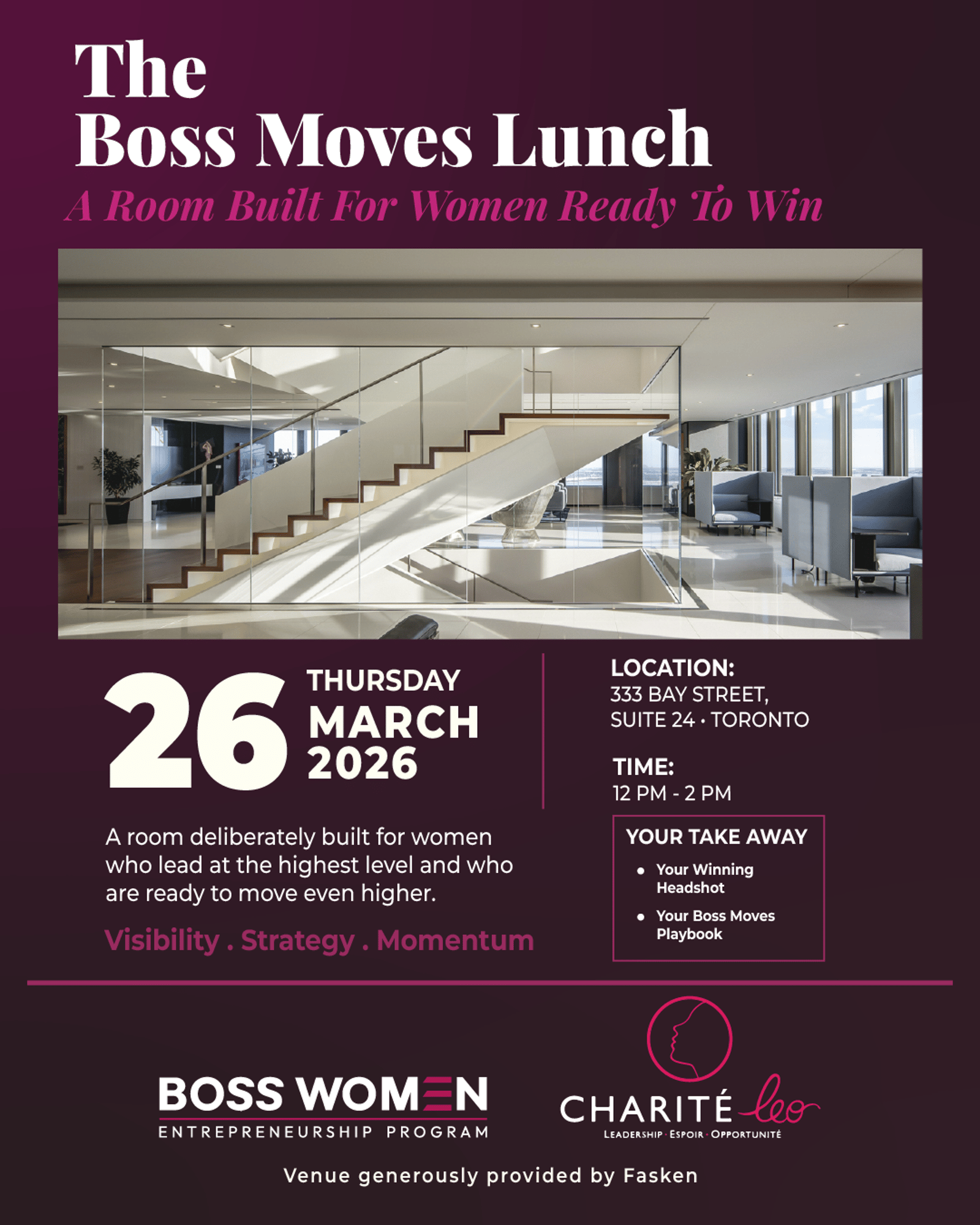 Date: Thursday, March 26, 2026 Time: 12 PM – 2 PM Location: Fasken · 333 Bay Street, Suite 24 · Toronto Presented by: Boss Women Entrepreneurship Program & La Passerelle I.D.É. #GiveToGain · #PowerBossMoves