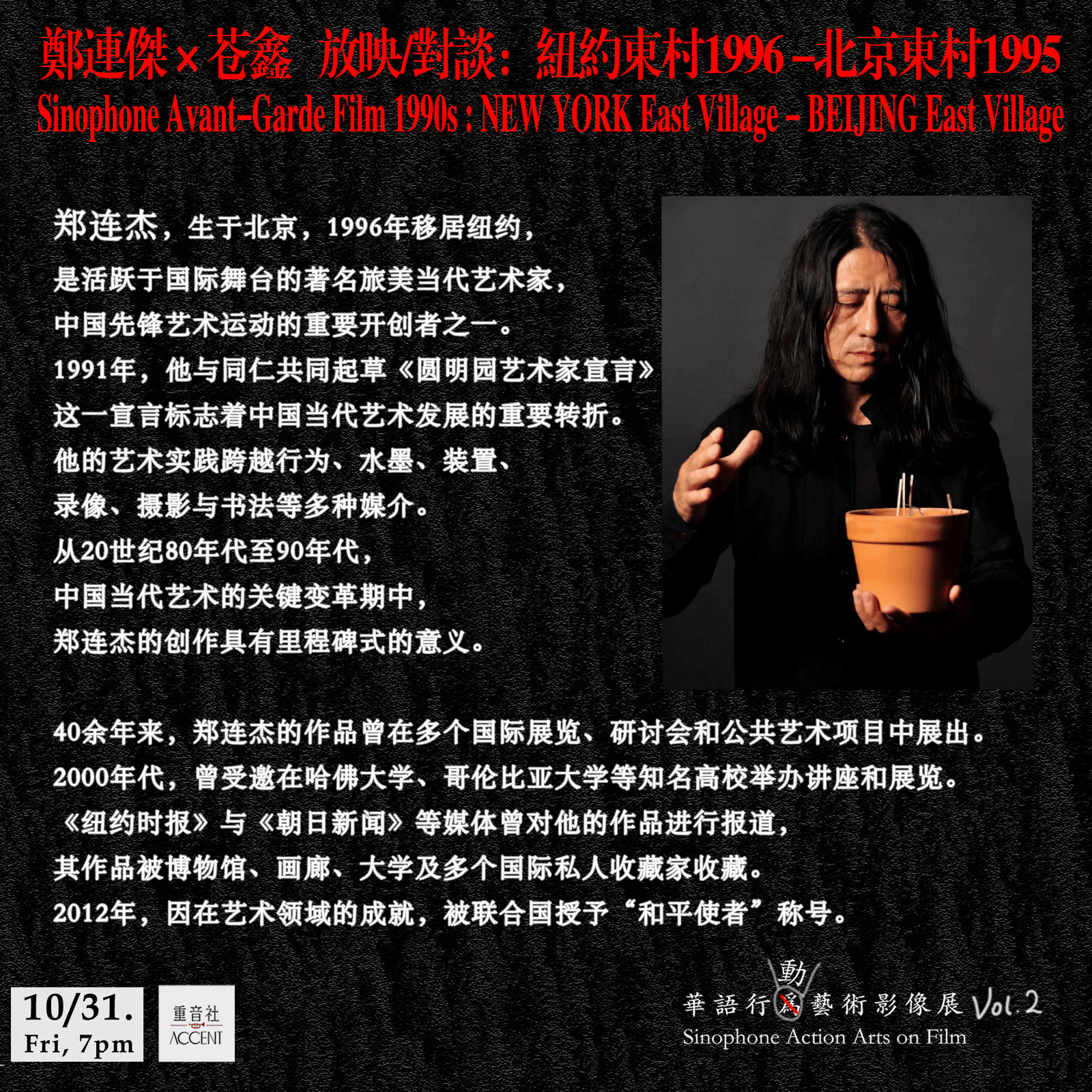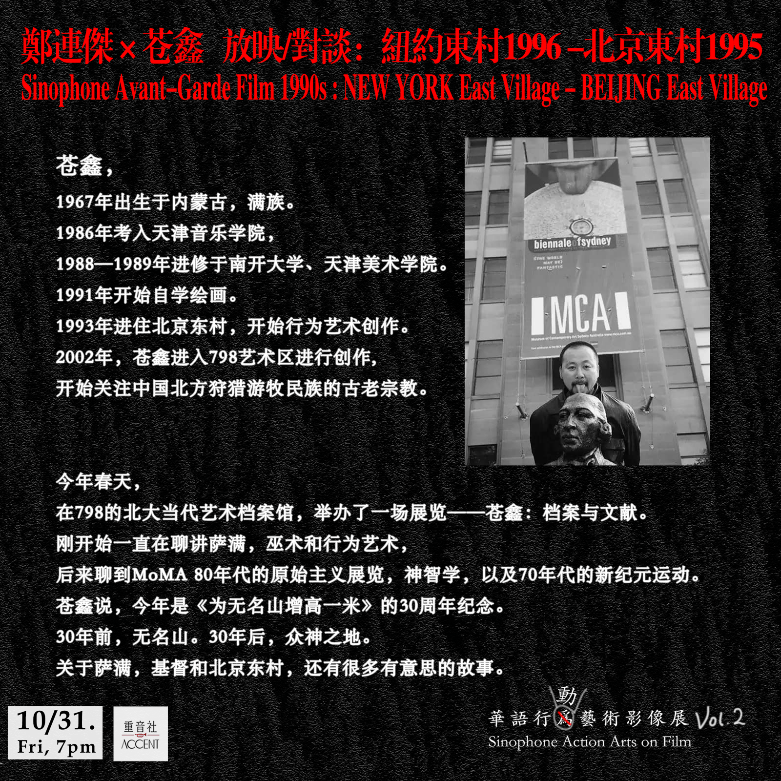 鄭連傑 X 苍鑫 紐約東村1996 -北京東村1995 (華語行動藝術影像展 Sinophone Action Arts on Film: New York East Village 1996 - Beijing East Village 1995 )