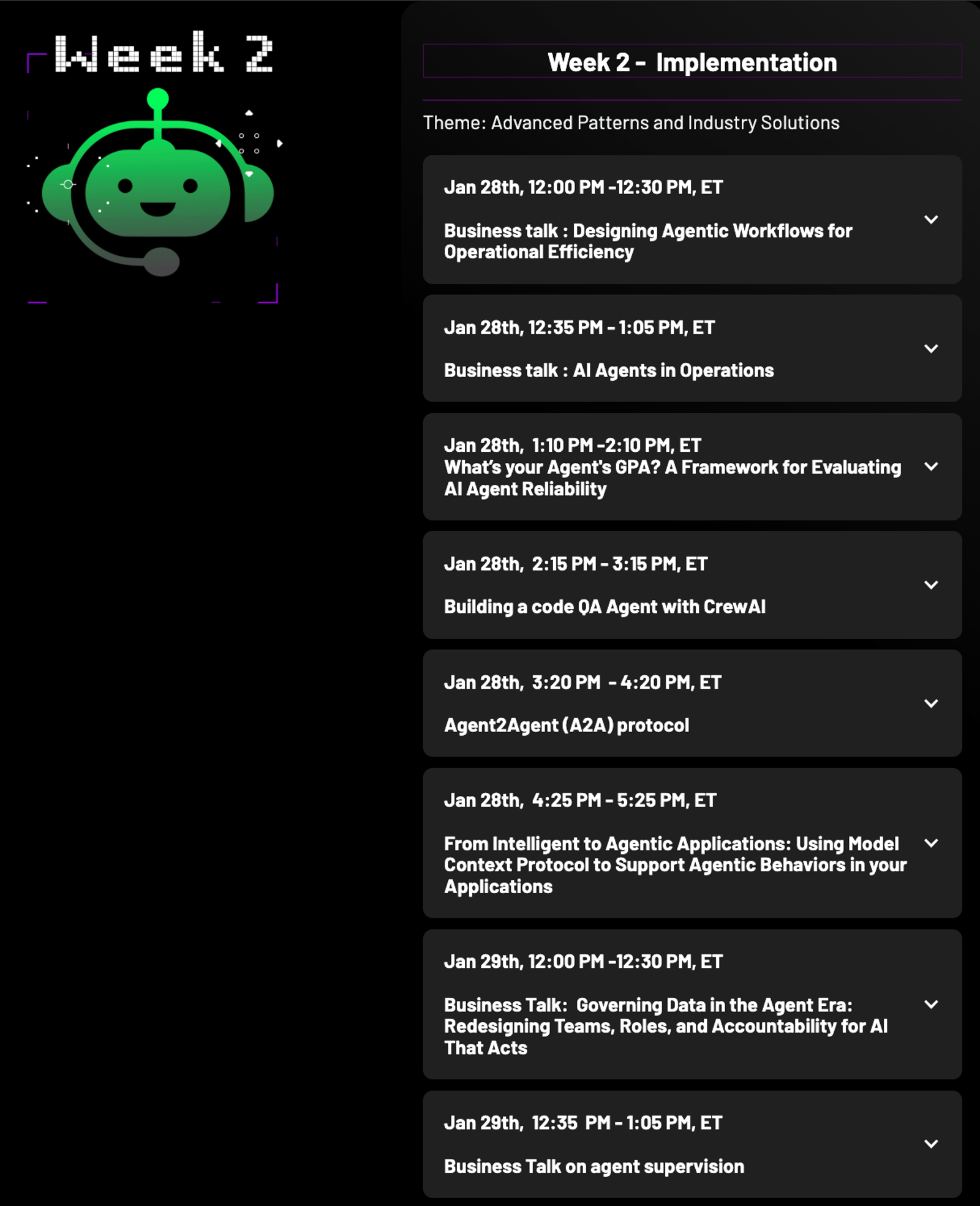 Focus on real-world applications with sessions on agent evaluation, reliability, deployment strategies, and cumulative demo showcases.