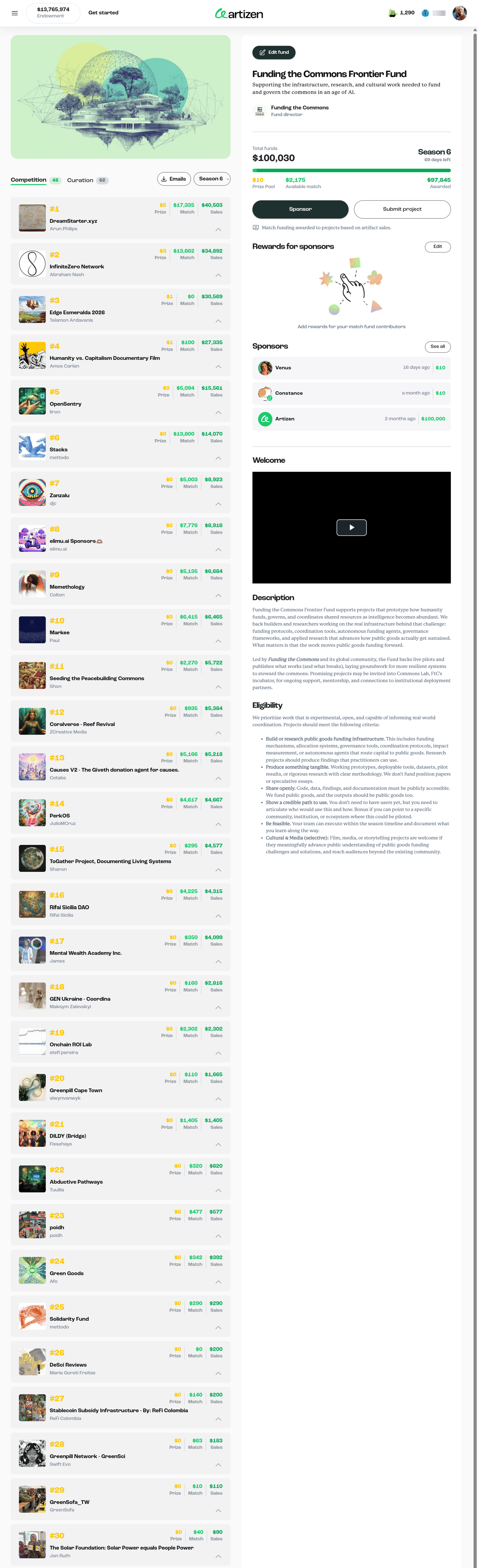 The Artizen x Funding the Commons Frontier Fund is a $100,000 live funding experiment backing the builders and researchers working on the real infrastructure behind how public goods get funded, governed, and sustained in an age of AI.