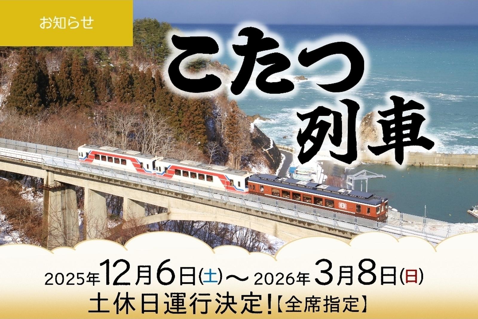 車内では、うに、あわび、ほたてなどを使用した海の幸満載のお弁当や、人気のスイーツを堪能できます! 車内イベントも盛り沢山な内容となっております! 温かいこたつに入りながら冬の味覚、車窓からの景色をお楽しみください。 皆さまのご乗車を心よりお待ちしております!