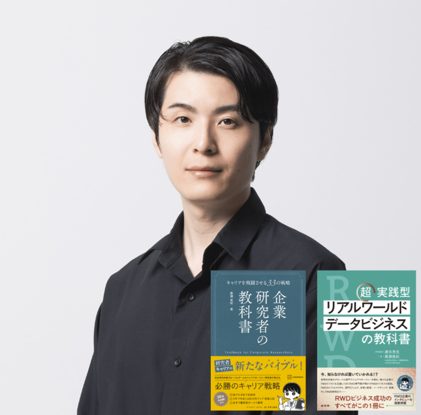 著書に「企業研究者の教科書 キャリアを飛躍させる33の戦略(講談社)」「超実践型 リアルワールドデータビジネスの教科書(金芳堂)」がある。
