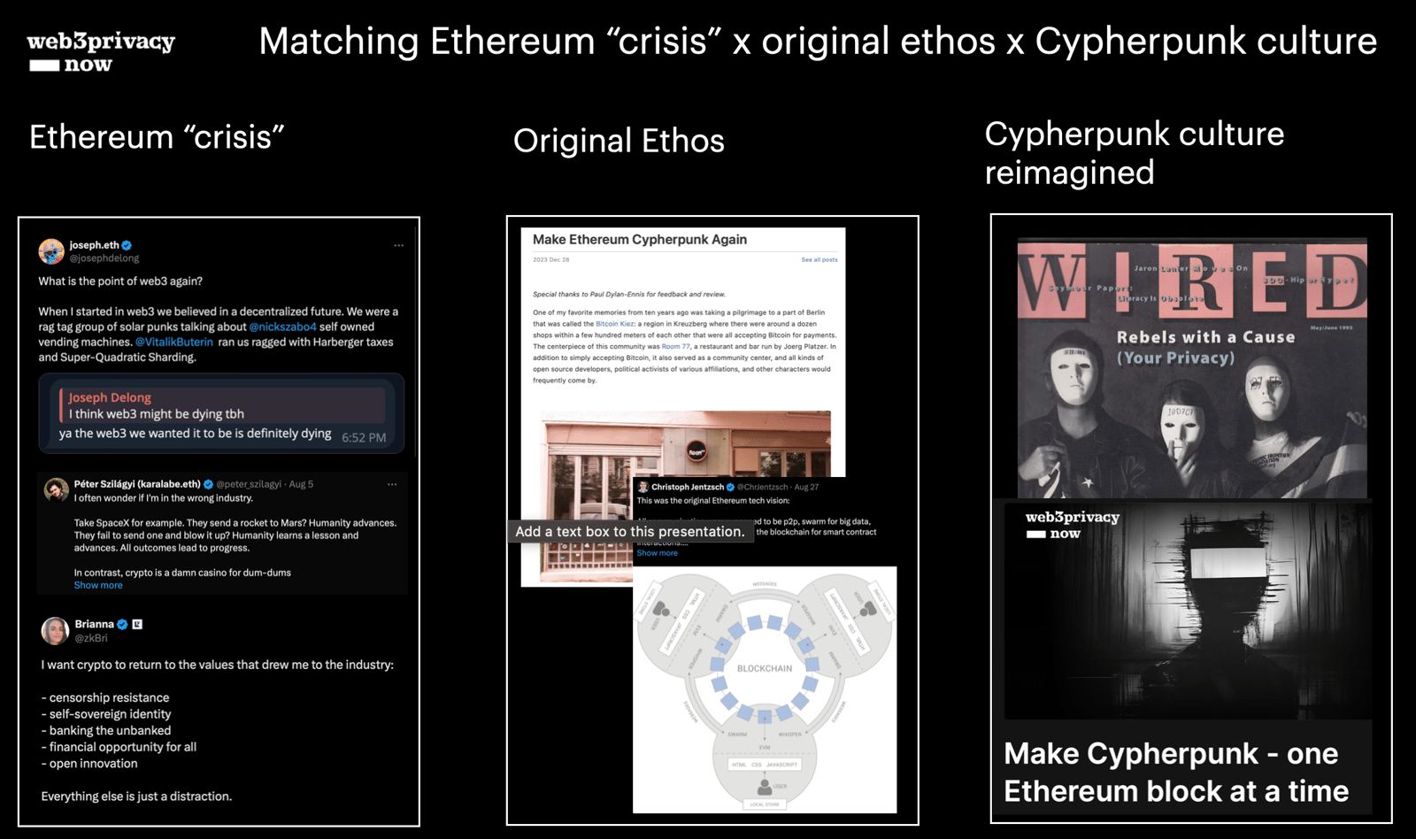 craft conditions needed to overcome challenges mapped in “Make Ethereum Cypherpunk again” essay
