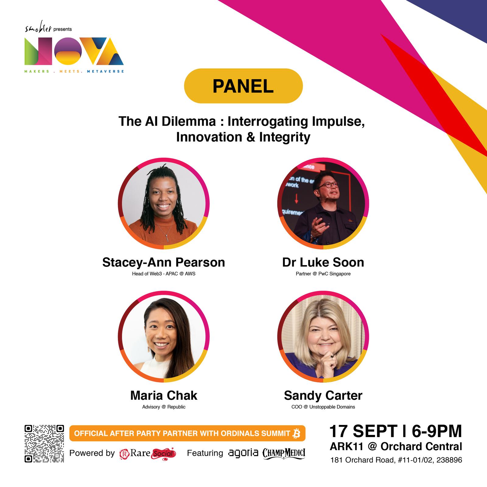 Panel The AI Dilemma : Interrogating Impulse, Innovation & Integrity will feature Stacey-Ann Pearson (Head of Web3 - APAC, AWS), Dr Luke Soon (Partner, PwC Singapore), Maria Chak (Advisory, Republic), and Sandy Carter (COO, Unstoppable Domains).