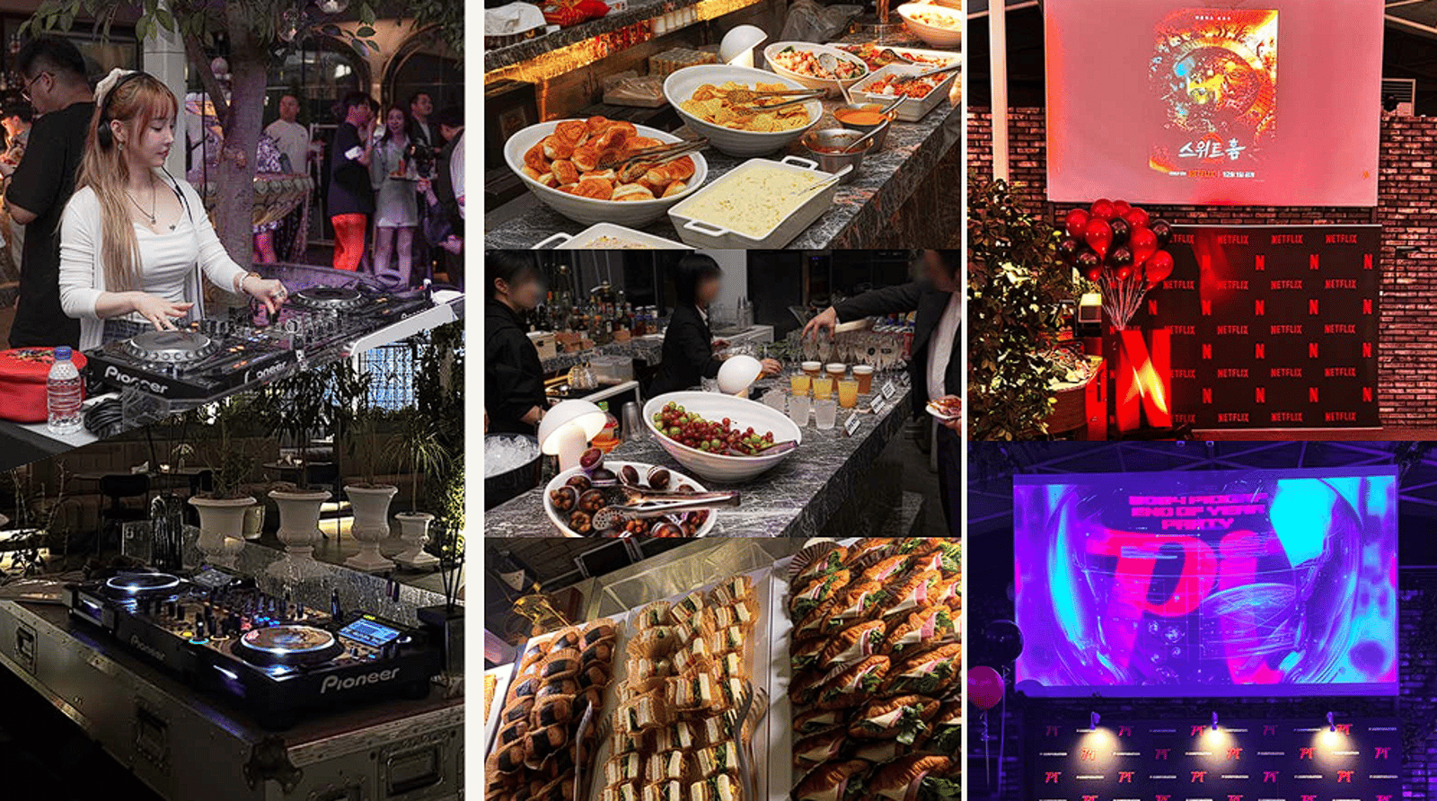무드를 완성하는 샴페인과 파인 케이터링, 그리고 라이브 DJ의 음악이 함께하는 우아한 밤을 즐겨보세요.