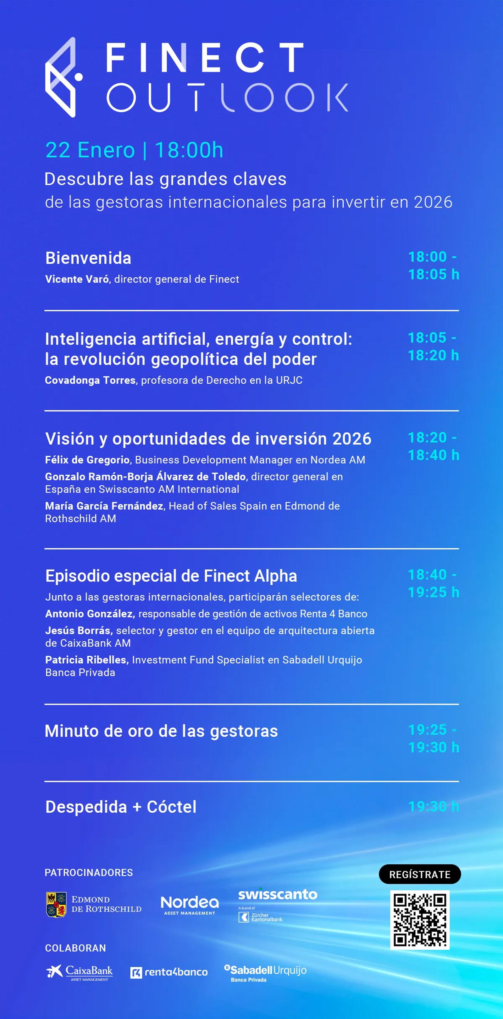 Para analizar estas cuestiones, Finect celebra Outlook 2026 el próximo 22 de enero de 2026 a las 17:30h, una cita imprescindible para los profesionales de la inversión. Contaremos con gestoras de primer nivel como Nordea Asset Management, Edmond de Rothschild Asset Management y Swisscanto Asset Management Internacional S.A., que compartirán sus perspectivas macro, su posicionamiento estratégico y las claves de asignación de activos con las que afrontan el nuevo año.