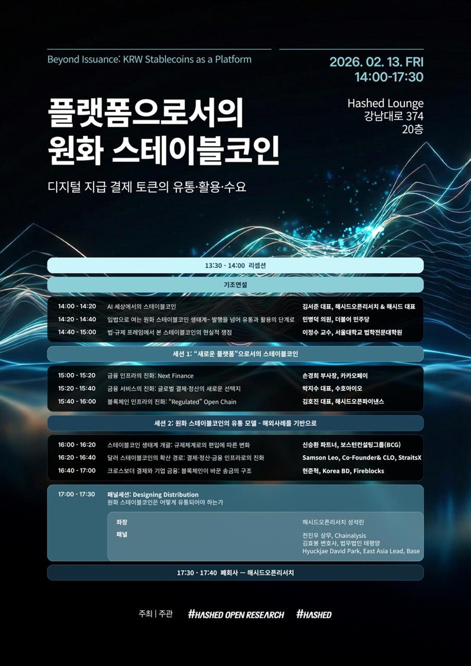 해시드오픈리서치와 해시드는 이러한 문제의식에서 출발하여, 이번 세미나를 통해 원화 스테이블코인을 발행 주체나 제도 설계에 국한된 논의 대상이 아닌, 사용·유통·정산이 유기적으로 연결된 금융 인프라 플랫폼의 관점에서 재조명하고자 합니다. 원화 스테이블코인의 발행 논의를 넘어, 실제 유통 구조와 활용 사례, 그리고 AI 에이전트가 경제 주체가 될 수 있는 미래 금융 생태계에서 스테이블코인과 그 기반 기술이 어떤 역할을 수행할 수 있는지를 구체적으로 살펴볼 것입니다.
