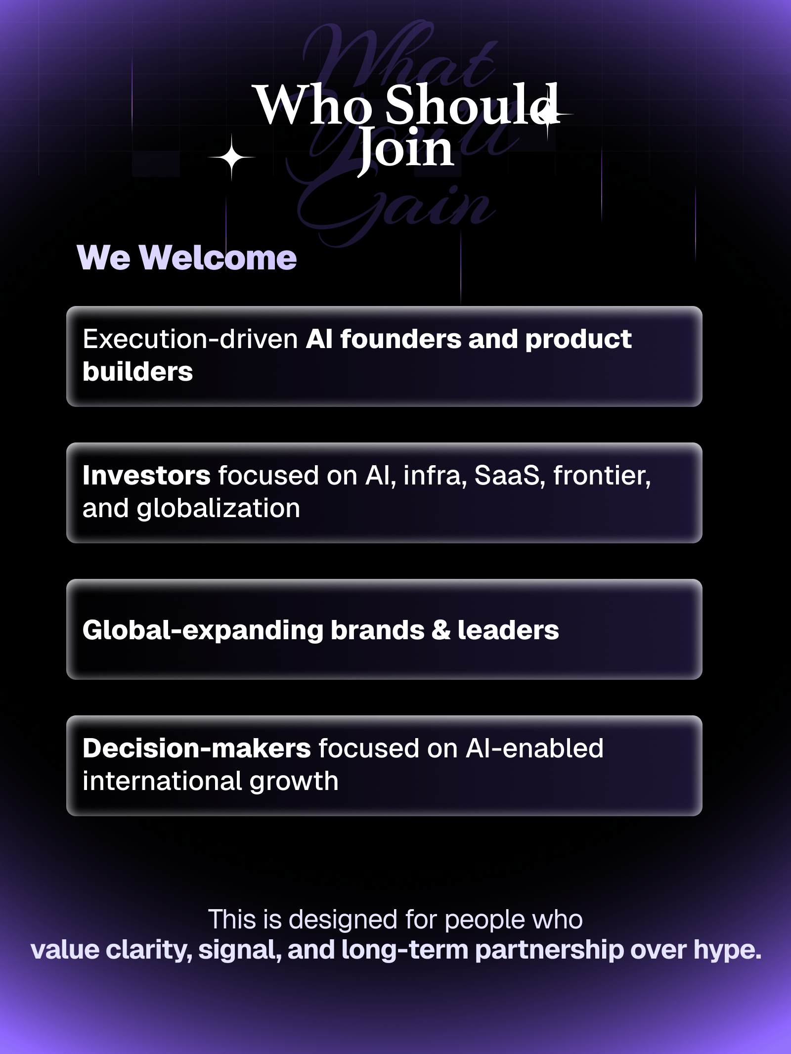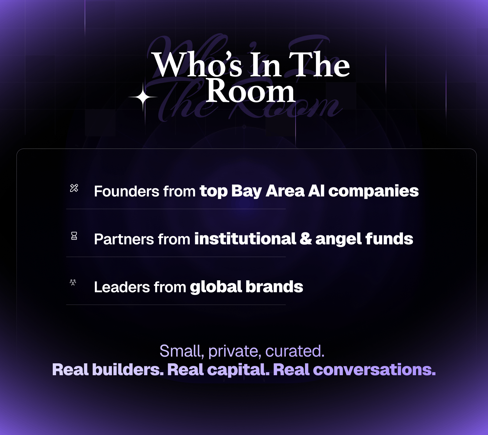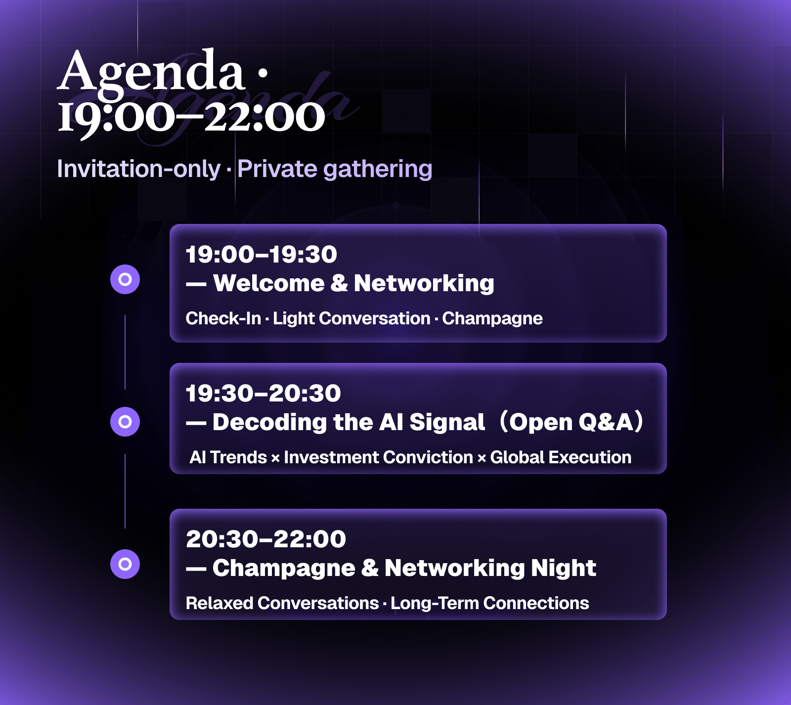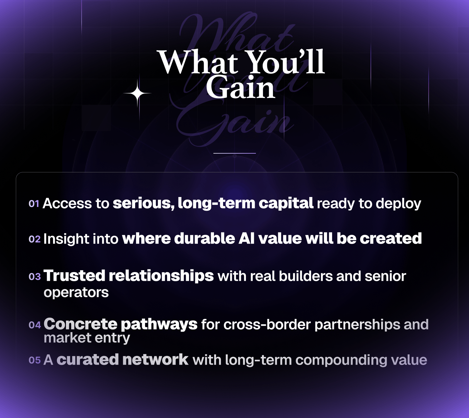 Expect a relaxed, chill-vibe evening — great drinks, great food, and real conversations with people genuinely building the future of AI. This private gathering offers rare access to trusted capital, cross-border partners, and long-term relationships.