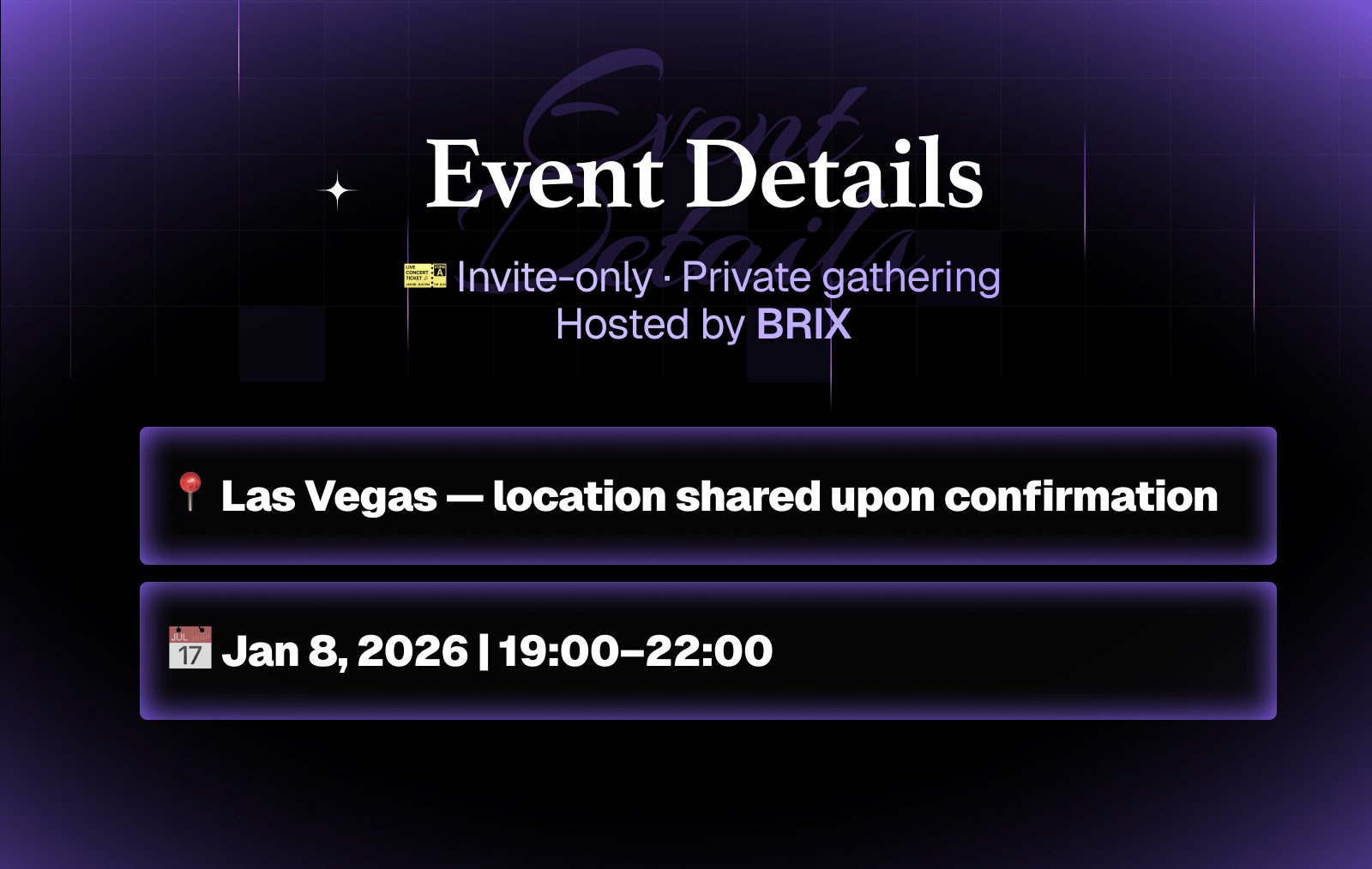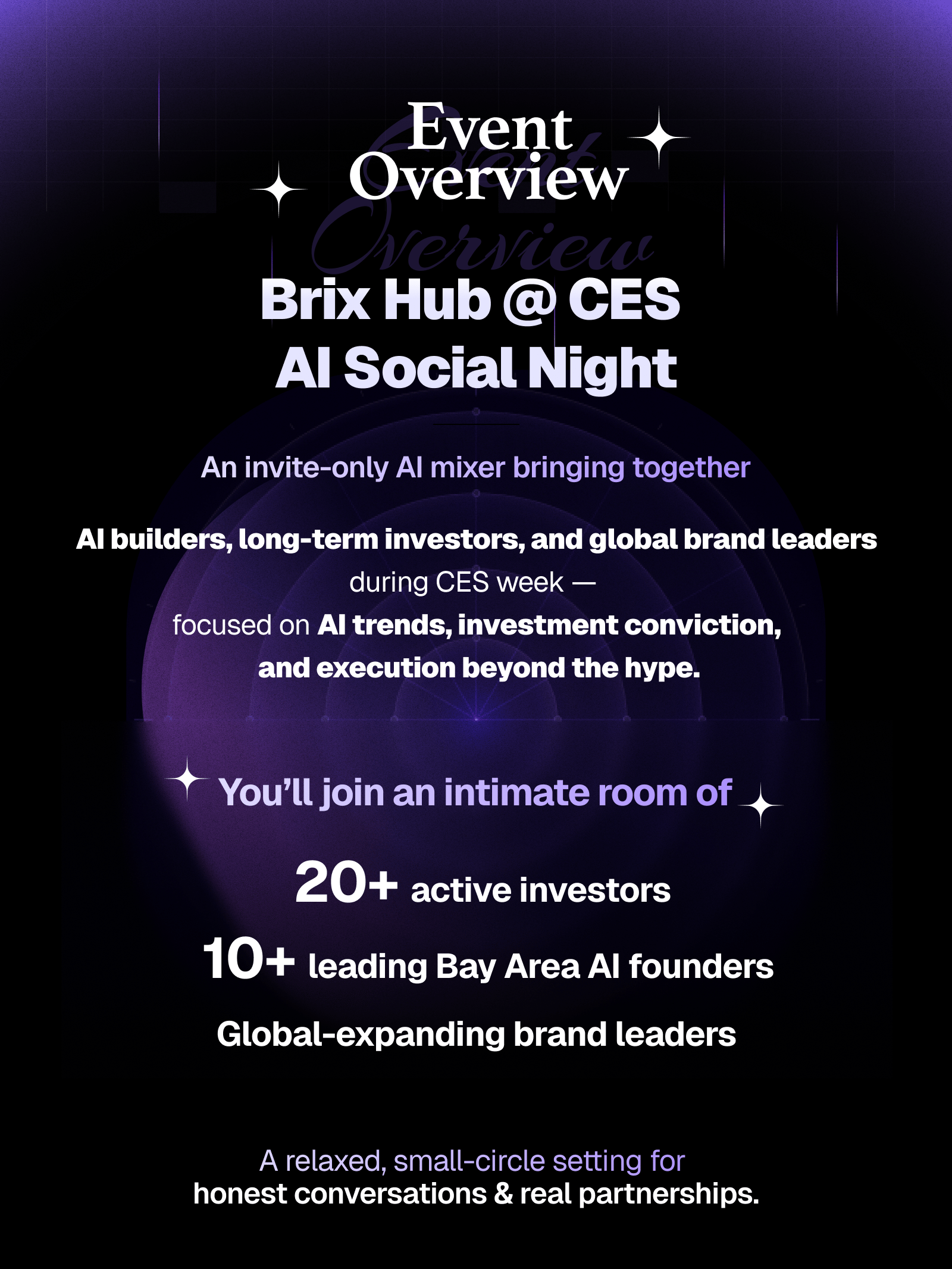 Hosted by Brix during CES week, this invitation-only AI Founder & Investor Social Night convenes a curated group of leading AI founders, global investors, and cross-border entrepreneurs for thoughtful discussion and relationship-driven networking.