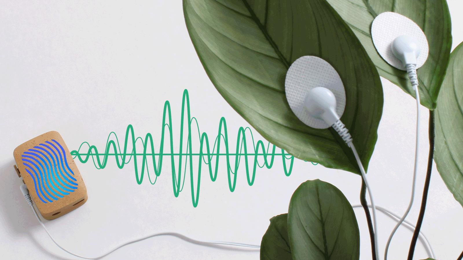Here's how it works: two small electrodes attach to a leaf. As the plant photosynthesizes, moves water, and responds to its environment — light, temperature, touch, your presence in the room — those invisible electrical fluctuations are mapped to musical notes and played live through custom instruments. Every single note is a direct expression of something happening inside the plant at that exact moment.